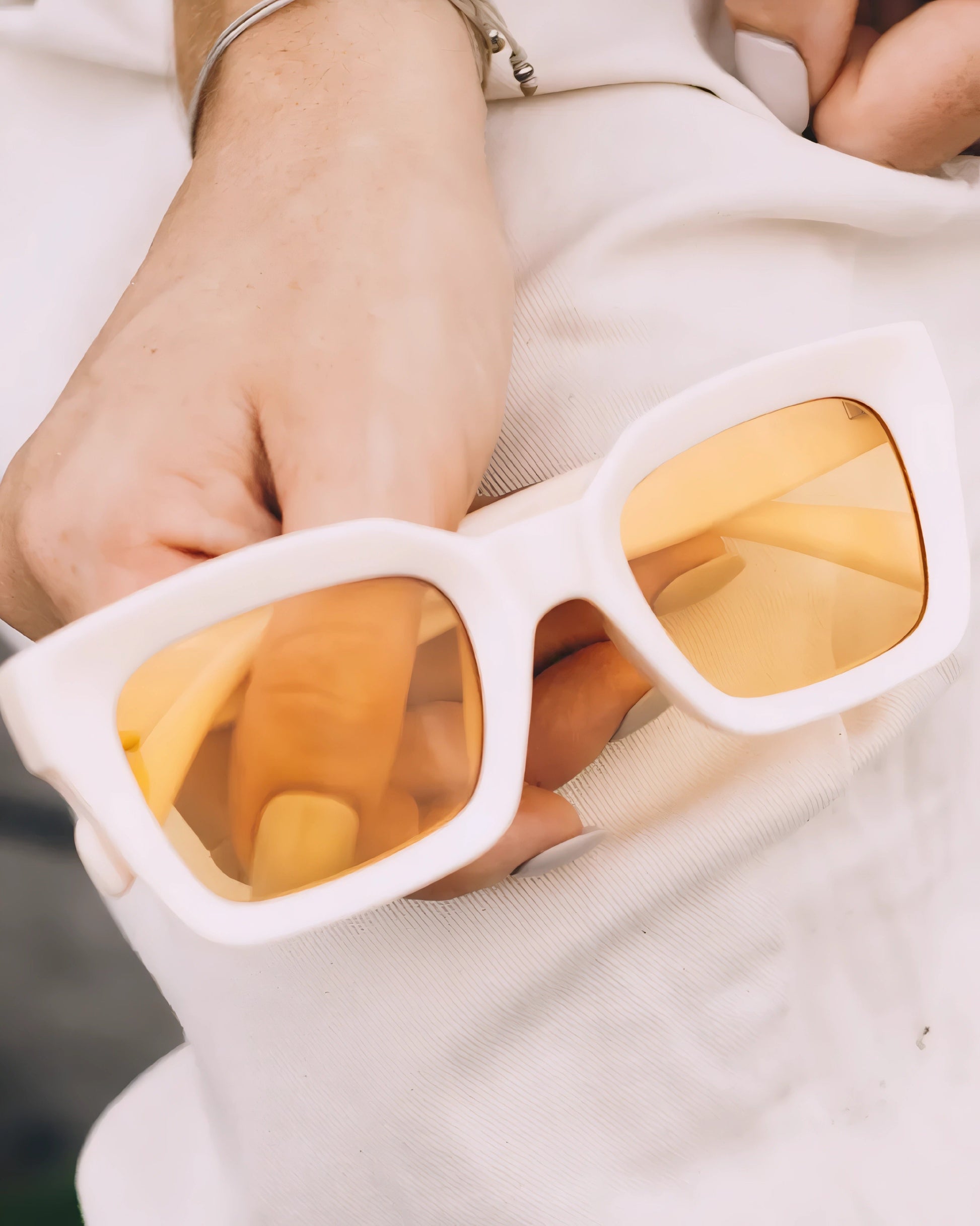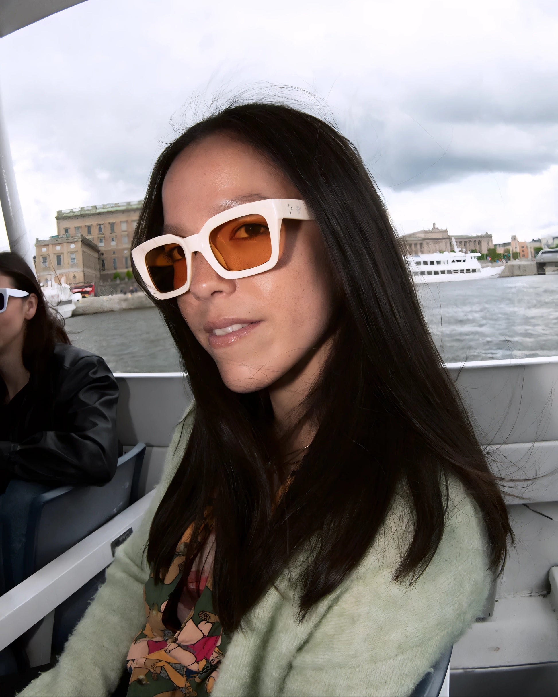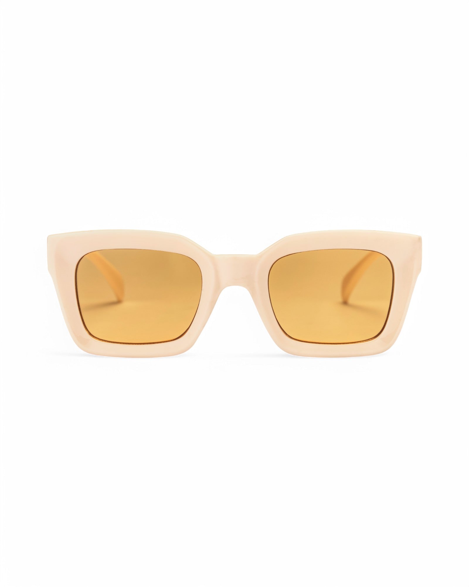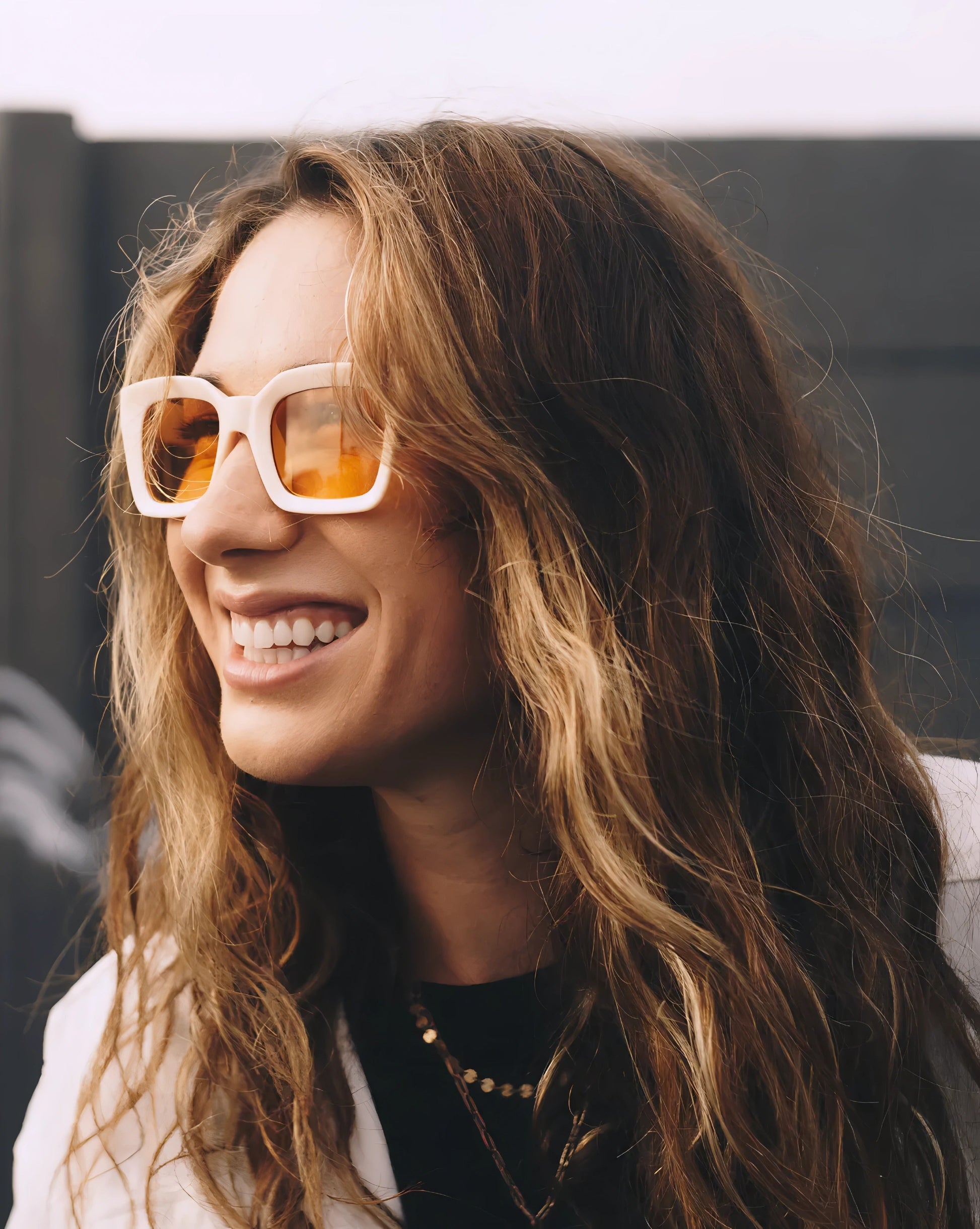 Anna frames channel vintage flair and timeless attitude, designed to go wherever you do. Cream frames with orange lenses made for standout days.