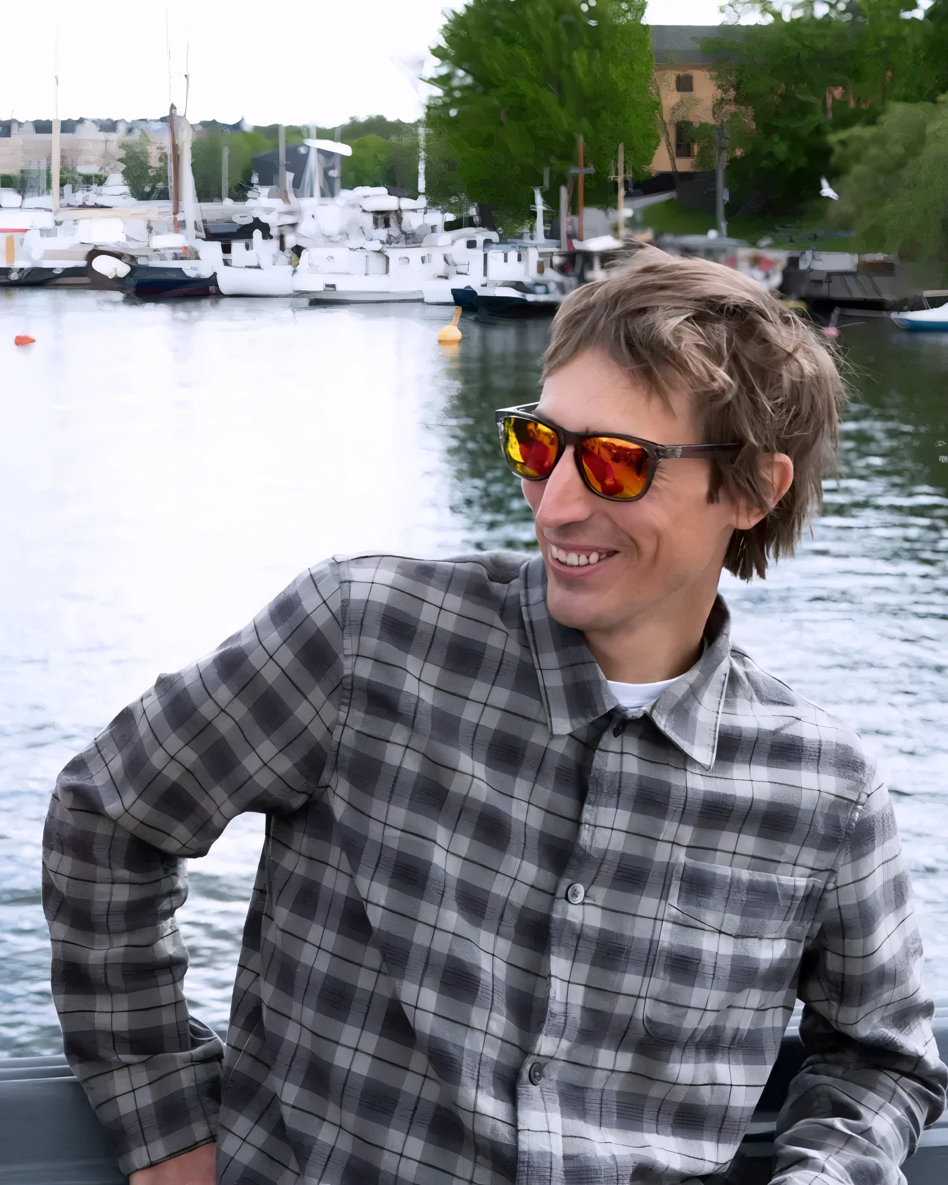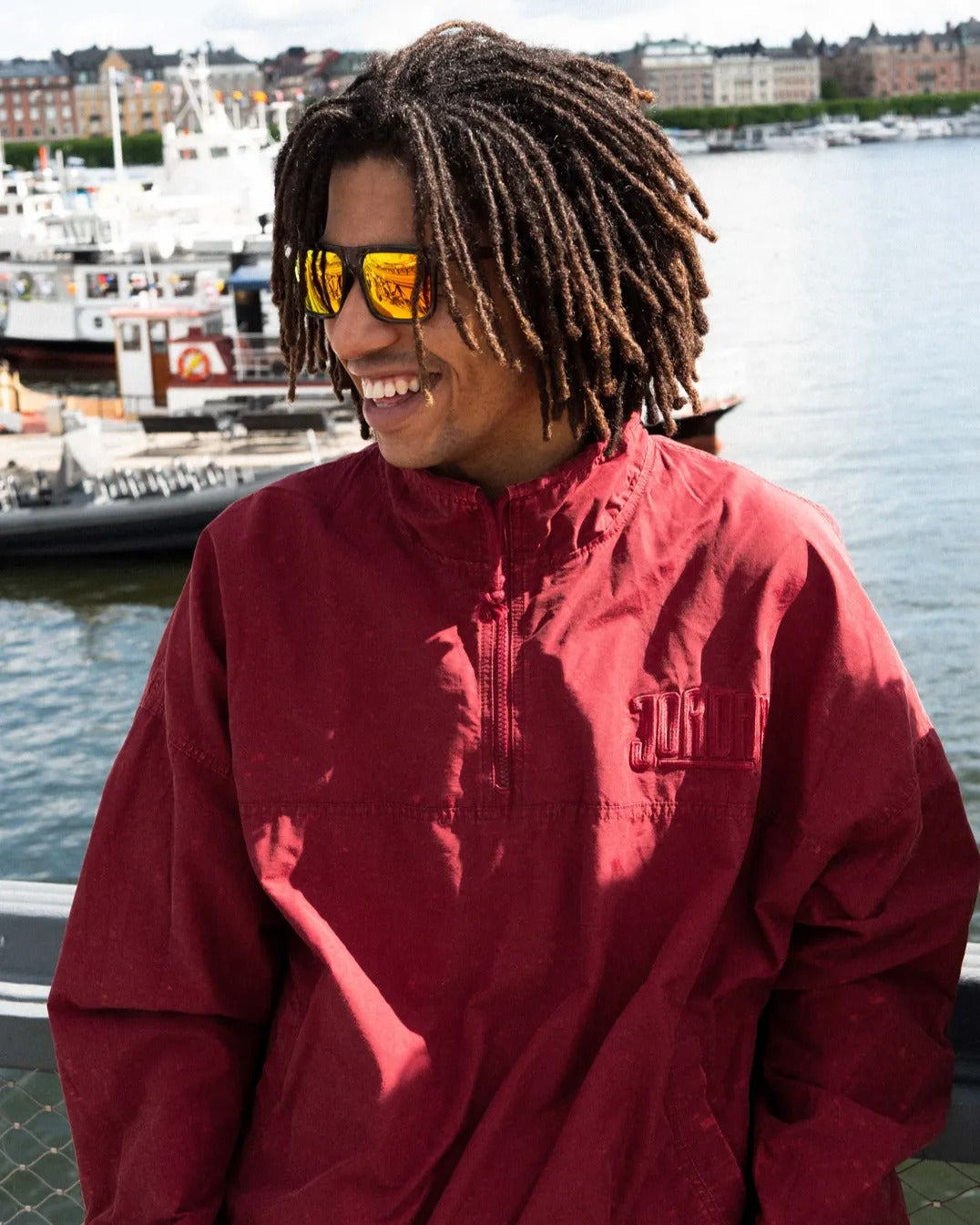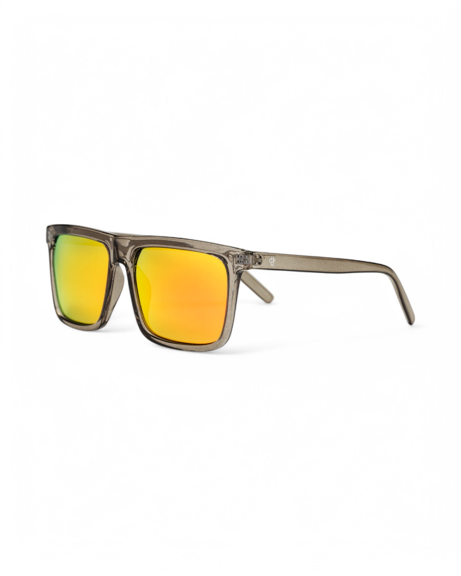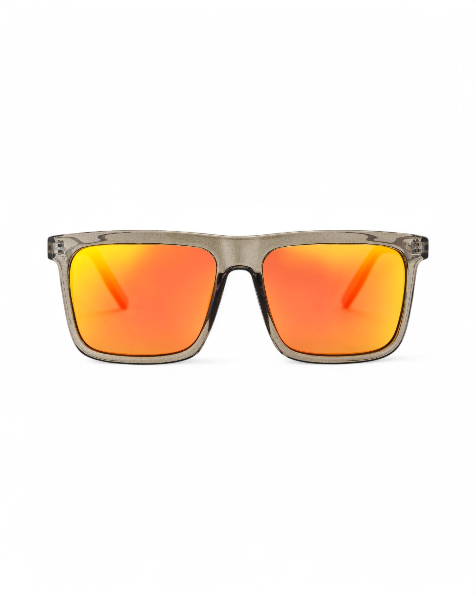 Bruce keeps things sharp and timeless—classic lines with a bold, modern twist. Grey frames with red mirror lenses made for standout days.