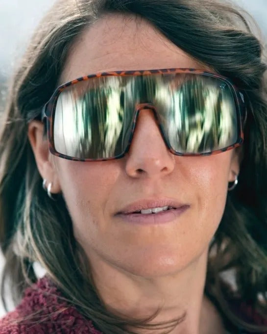Erica’s oversized square frames bring bold, standout style to any look. Turtle Brown frames with gold mirror lenses made for standout days.