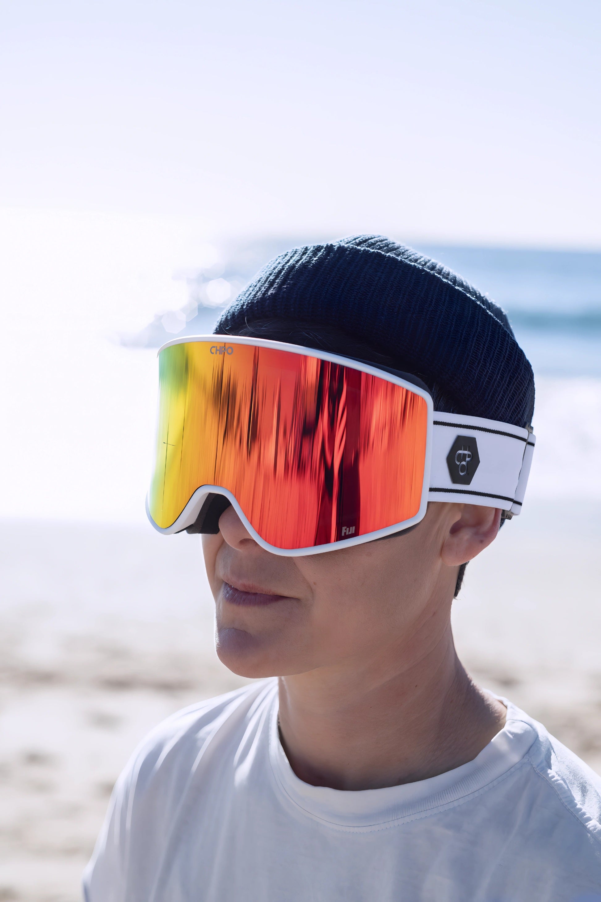Fiji snow goggles are built for peak days—crisp views, bold looks, all-mountain confidence. White frames with red mirror lenses made for standout days.