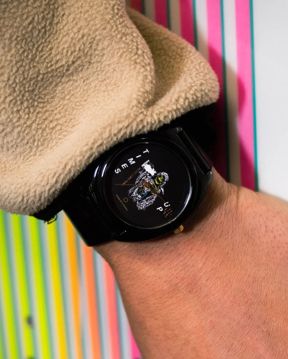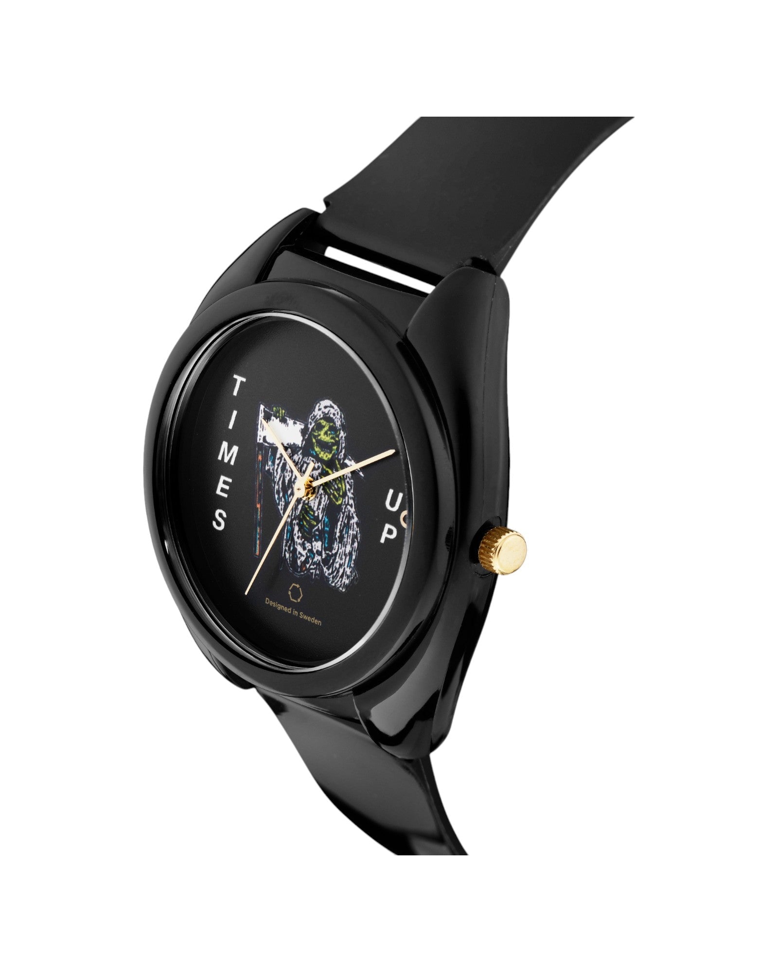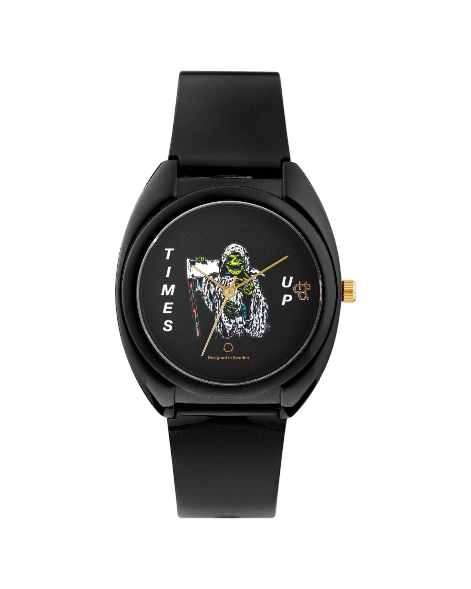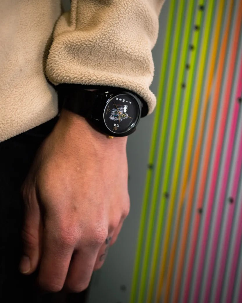 French brings strong angles and smooth finishes—designed to stand out, built to last. Black case meets a black dial and black recycled plastic strap—rugged tones, crisp edges.