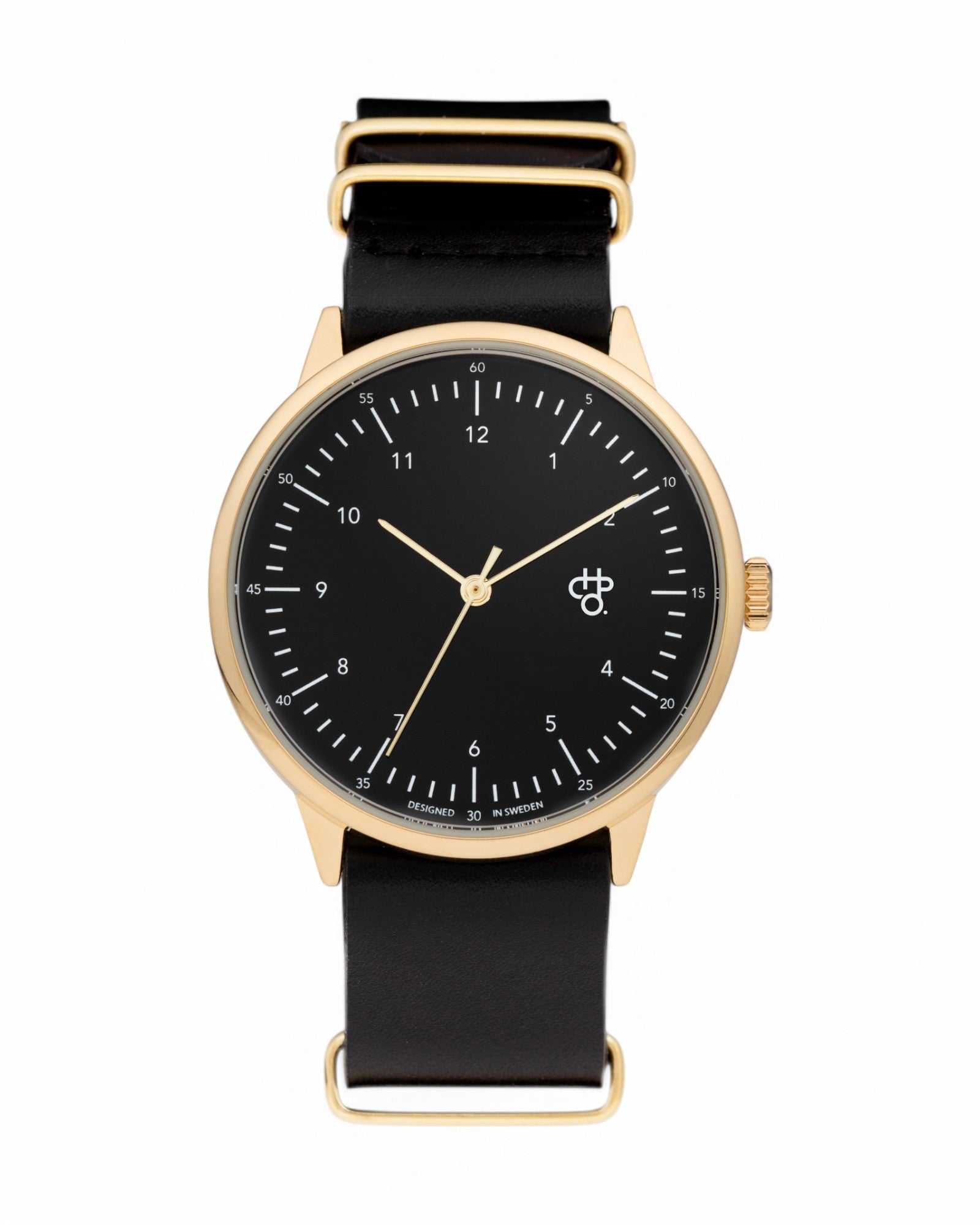 Harold pairs classic minimalism with quartz precision—clean lines and timeless cool. Gold case, black dial, and black vegan leather strap—classic colourways with sharp, minimal lines.