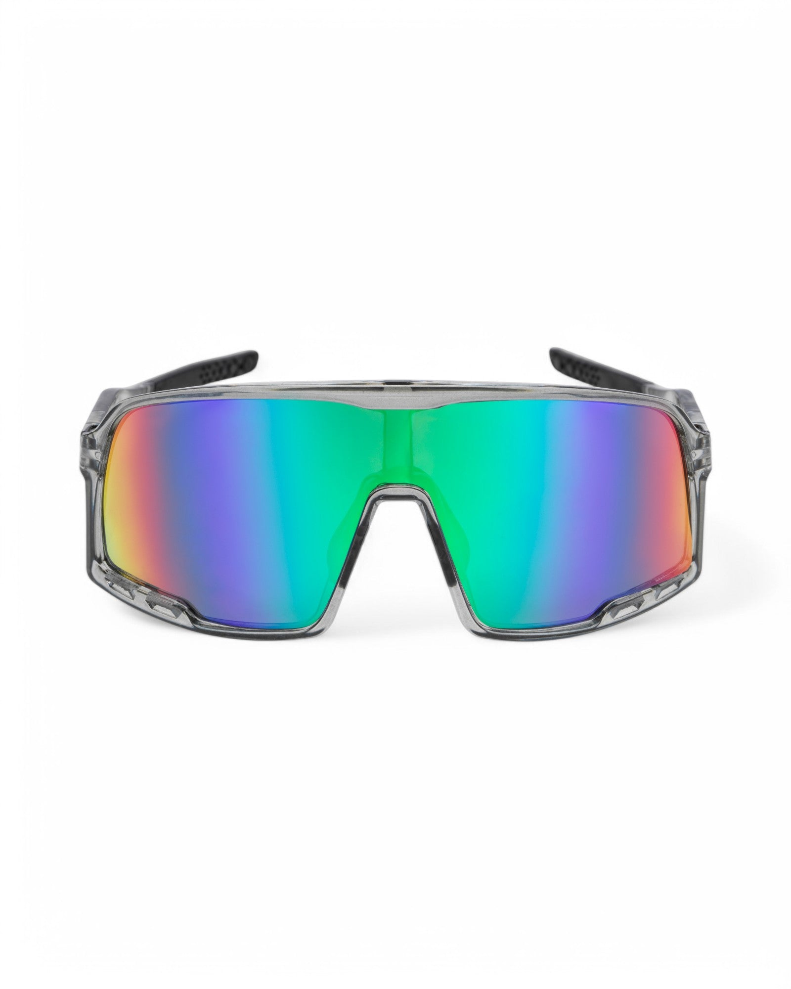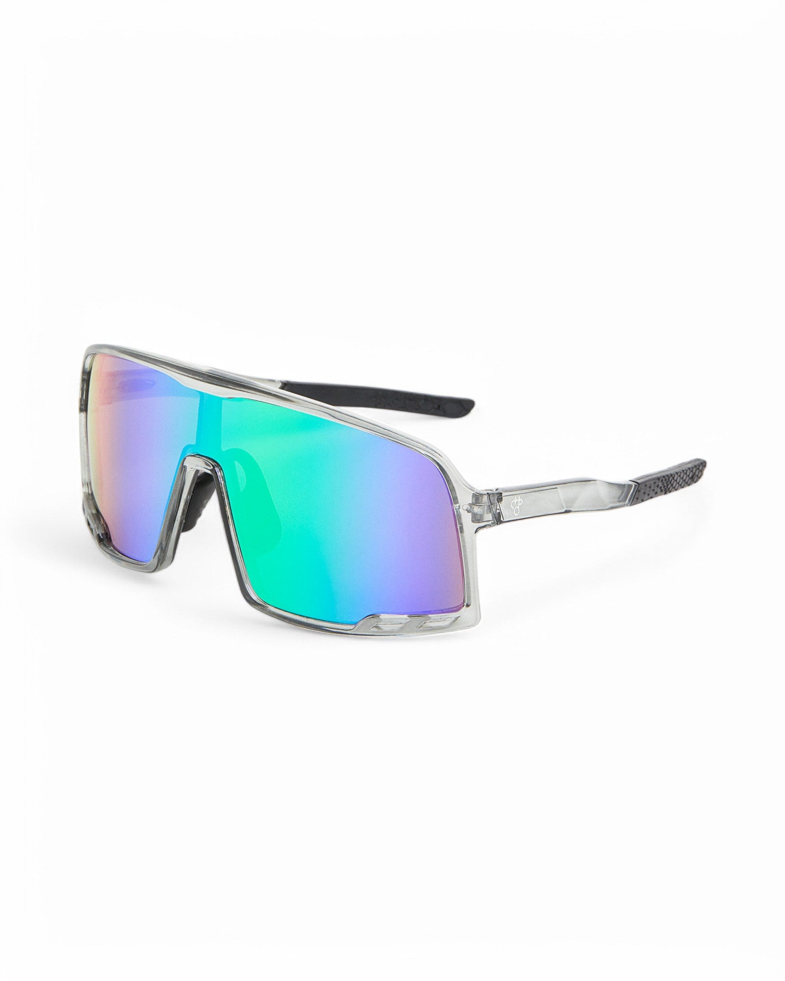 Henrik frames blend sharp lines and laid-back style—classic shades with modern cool. Transparent Grey frames paired with rainbow mirror lenses—sharp lines, clean finish.