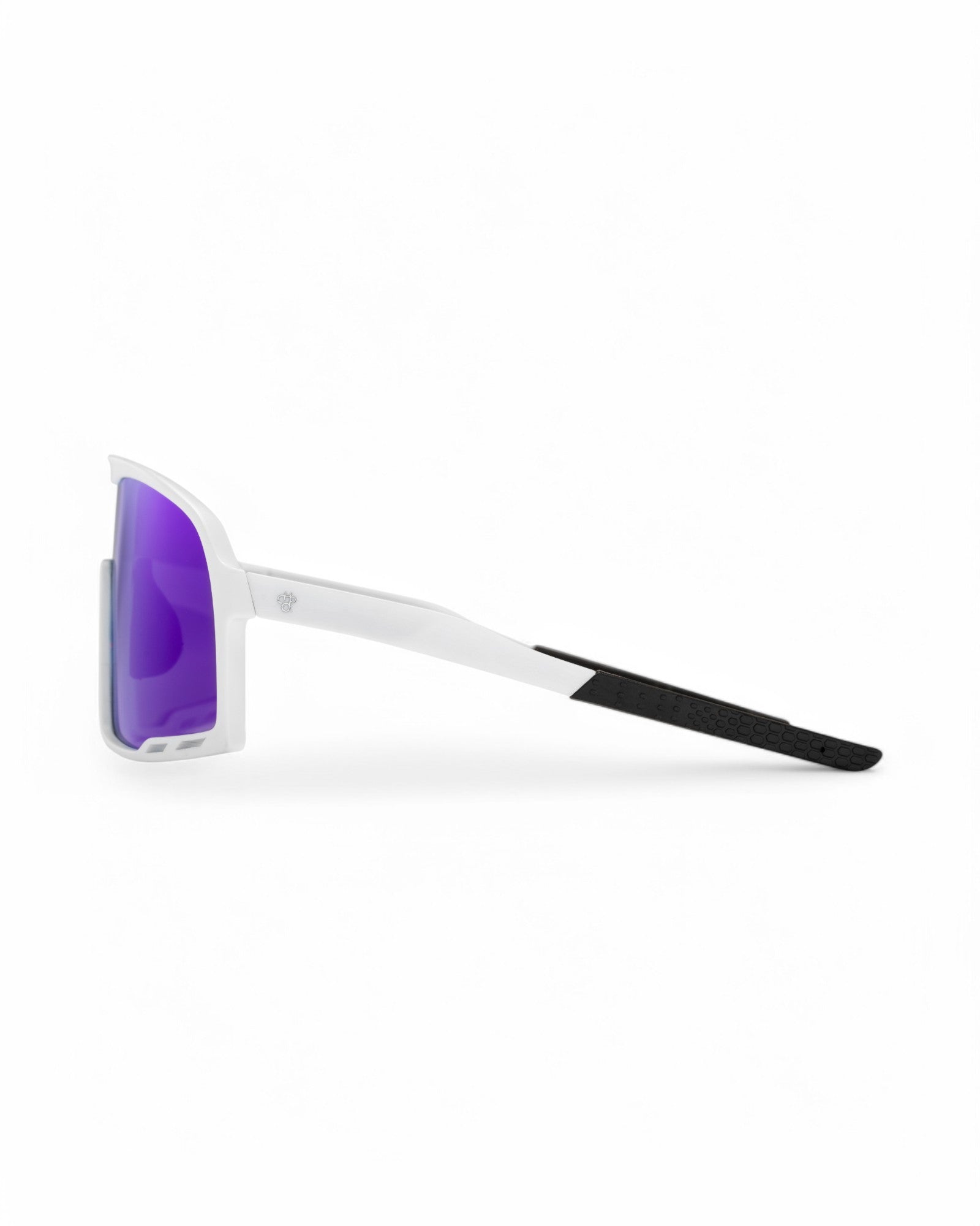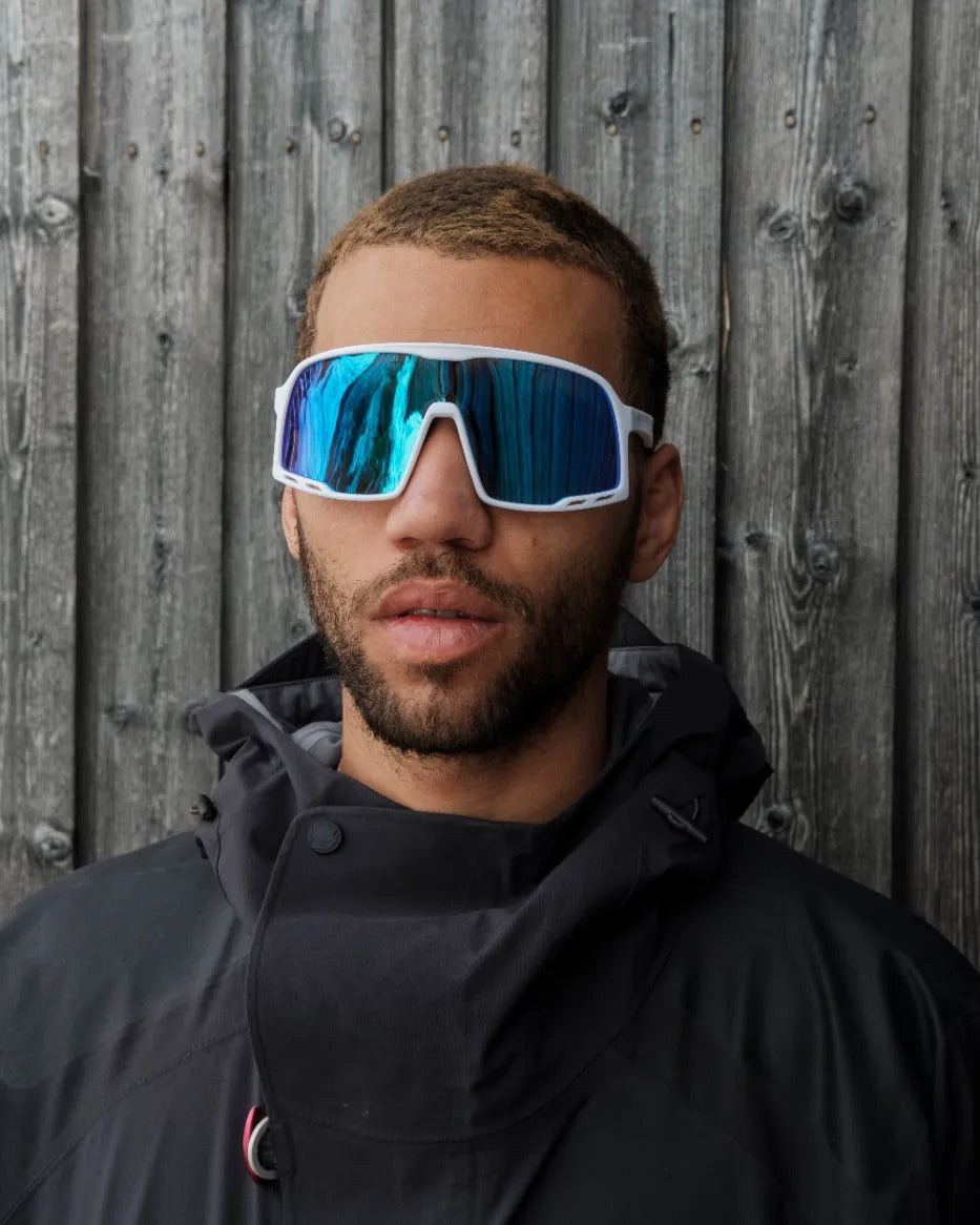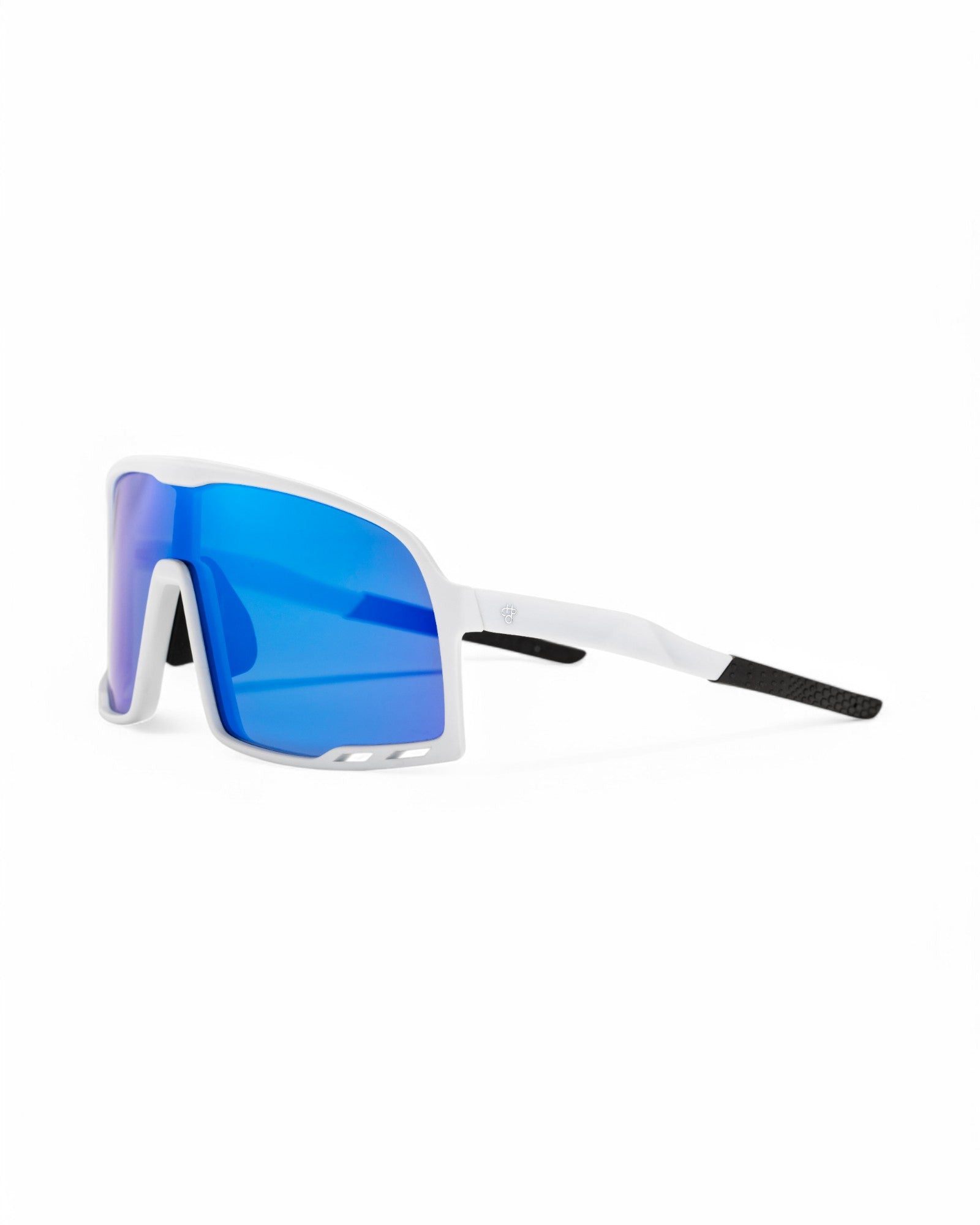 Henrik frames blend sharp lines and laid-back style—classic shades with modern cool. White frames paired with blue mirror lenses—sharp lines, clean finish.