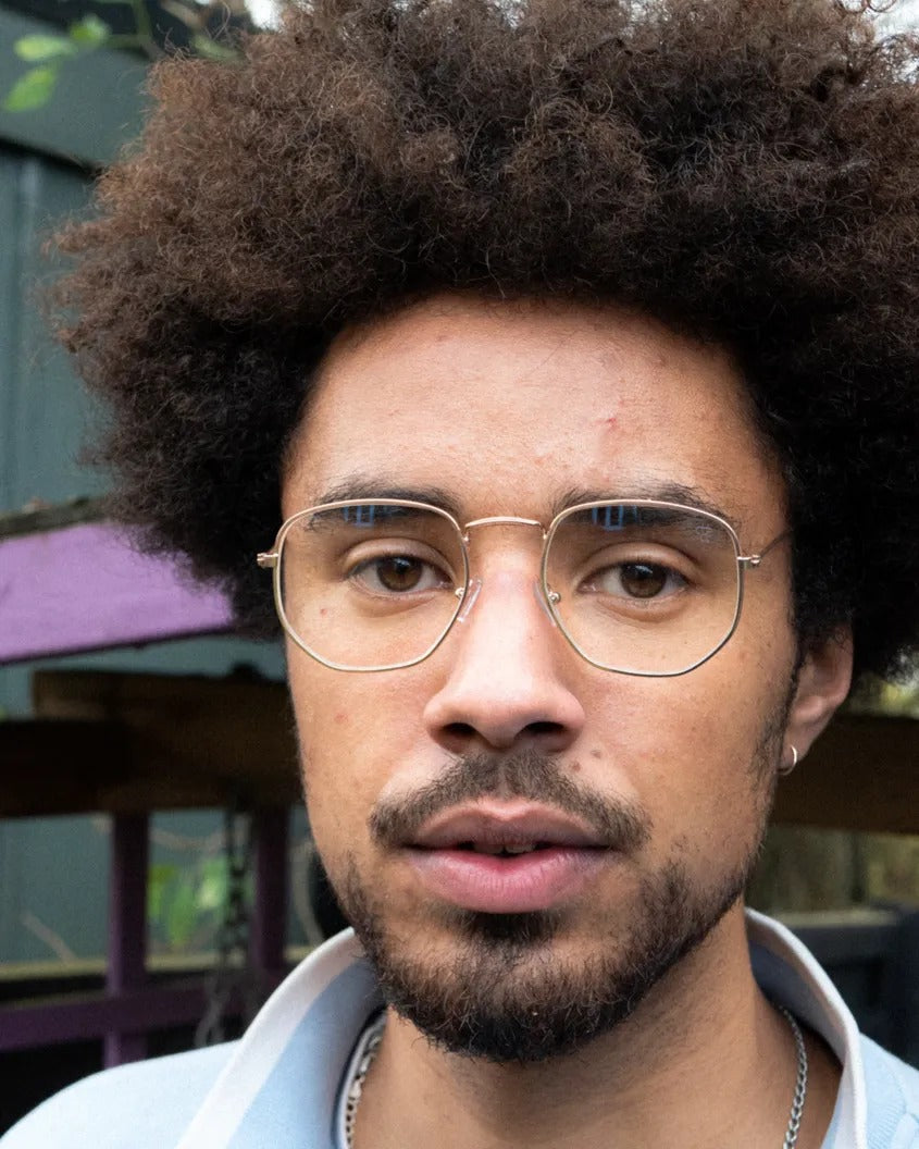 Ian blue light glasses cut glare, ease eye strain, and keep you scrolling sharp. Gold frames with transparent lenses—simple lines, standout style.