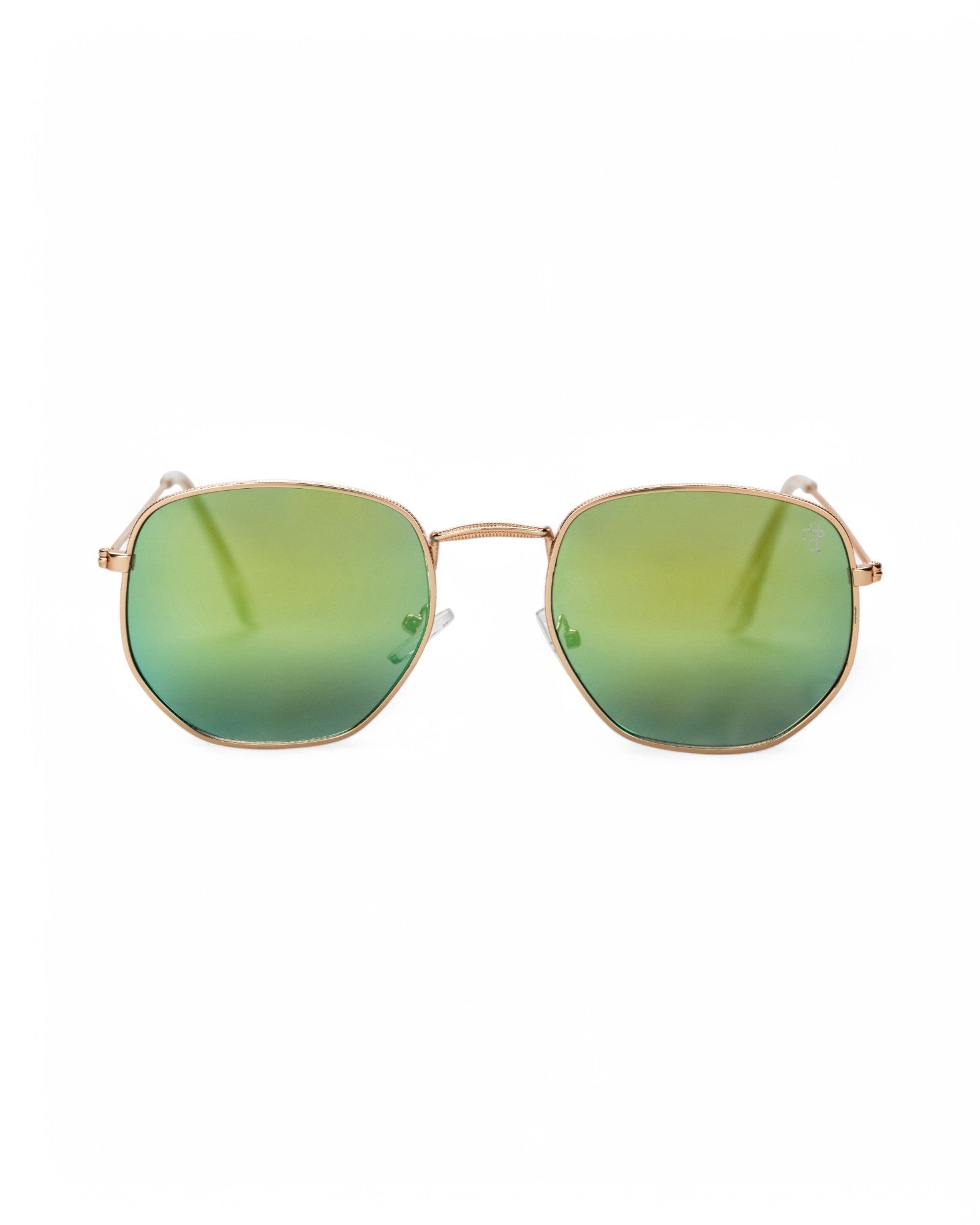 Ian frames bring sharp lines and bold presence—classic shades for any scene. Gold frames with green mirror lenses—simple lines, standout style.
