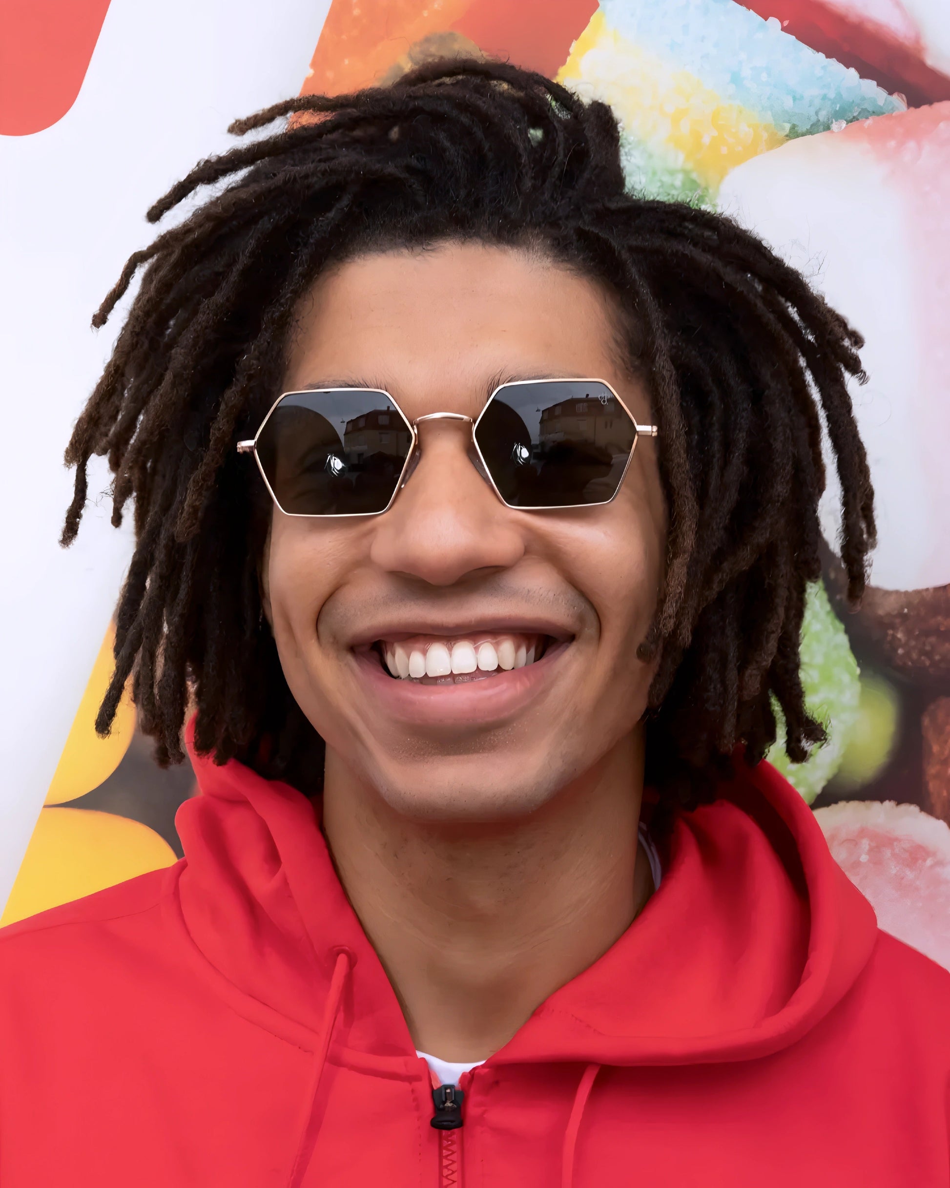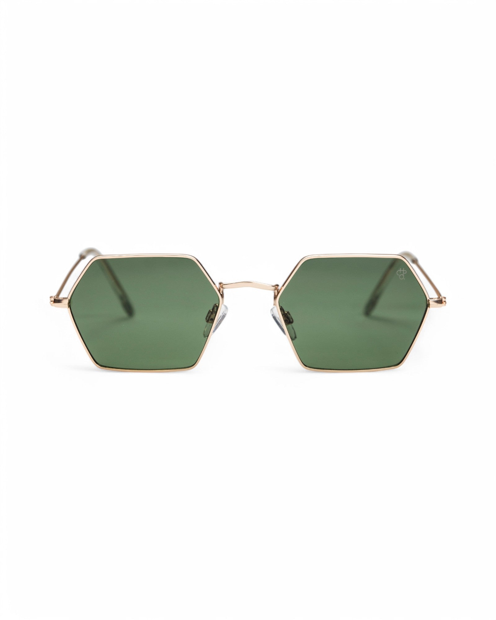 Jason’s oversized shape dials up the attitude—bold shades built to stand out. Oversized Gold frames clashed with green lenses—built to stand out.