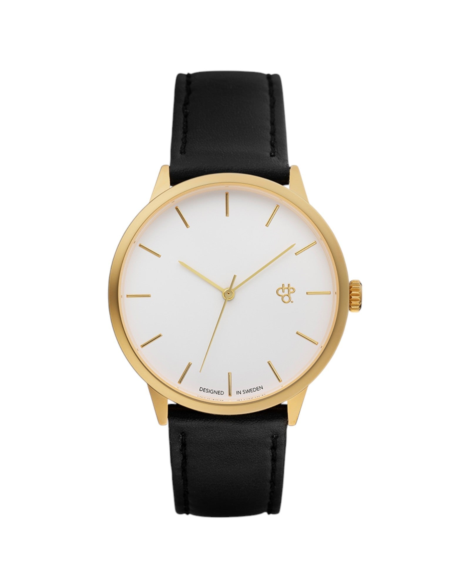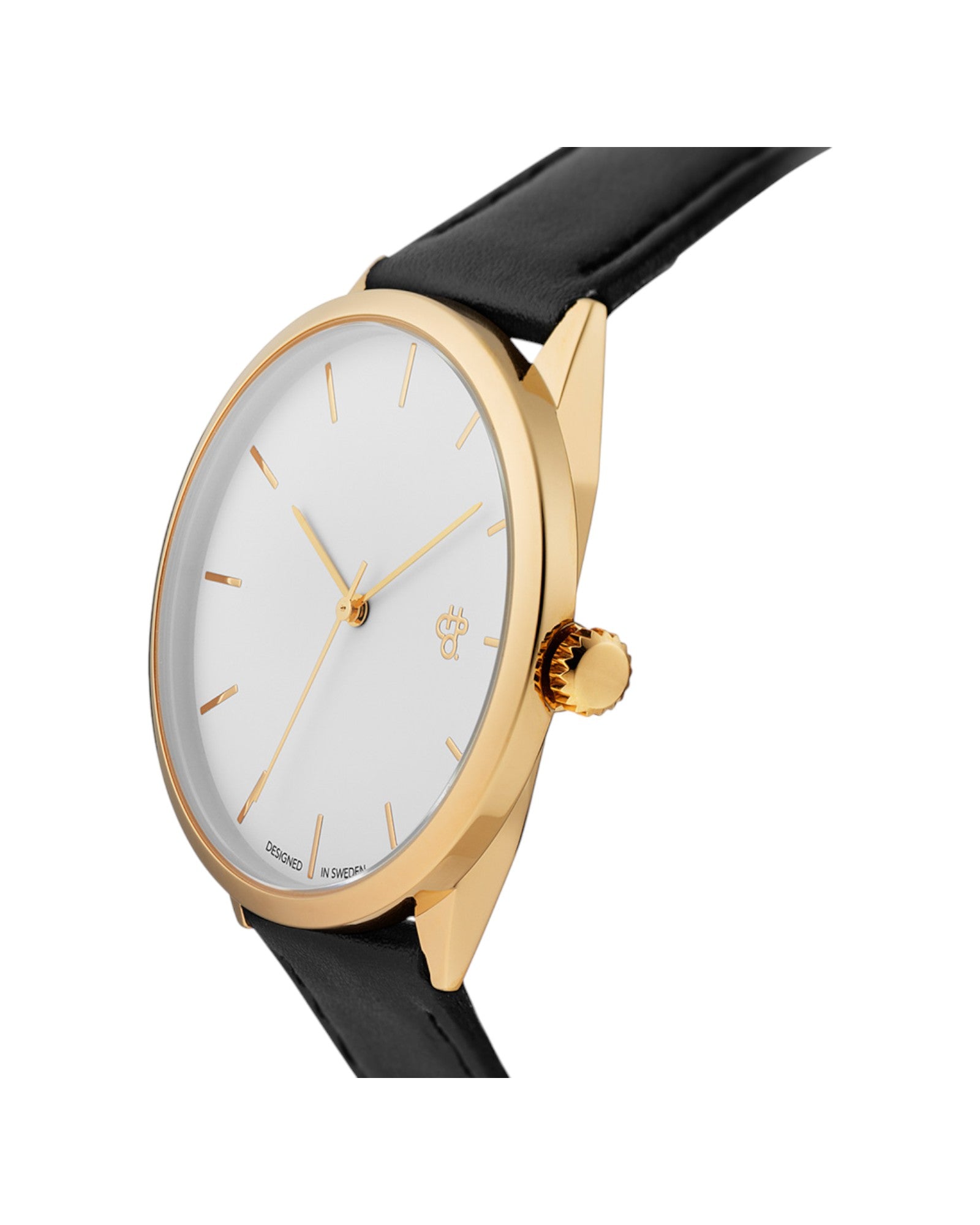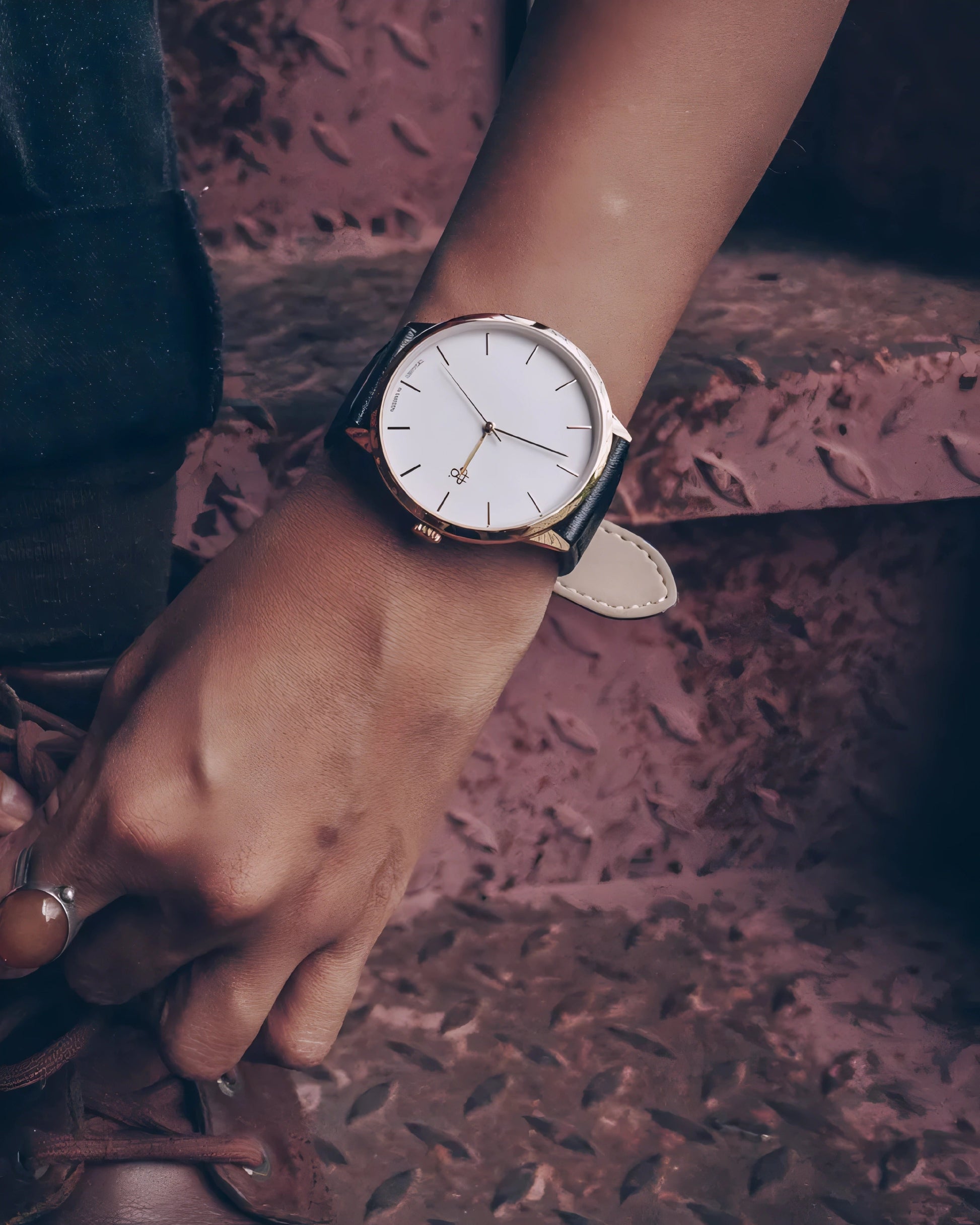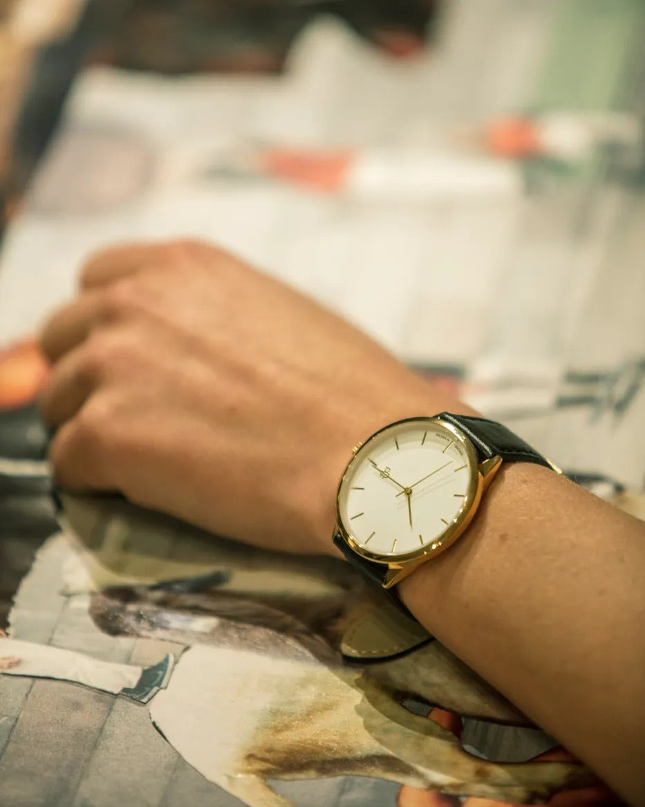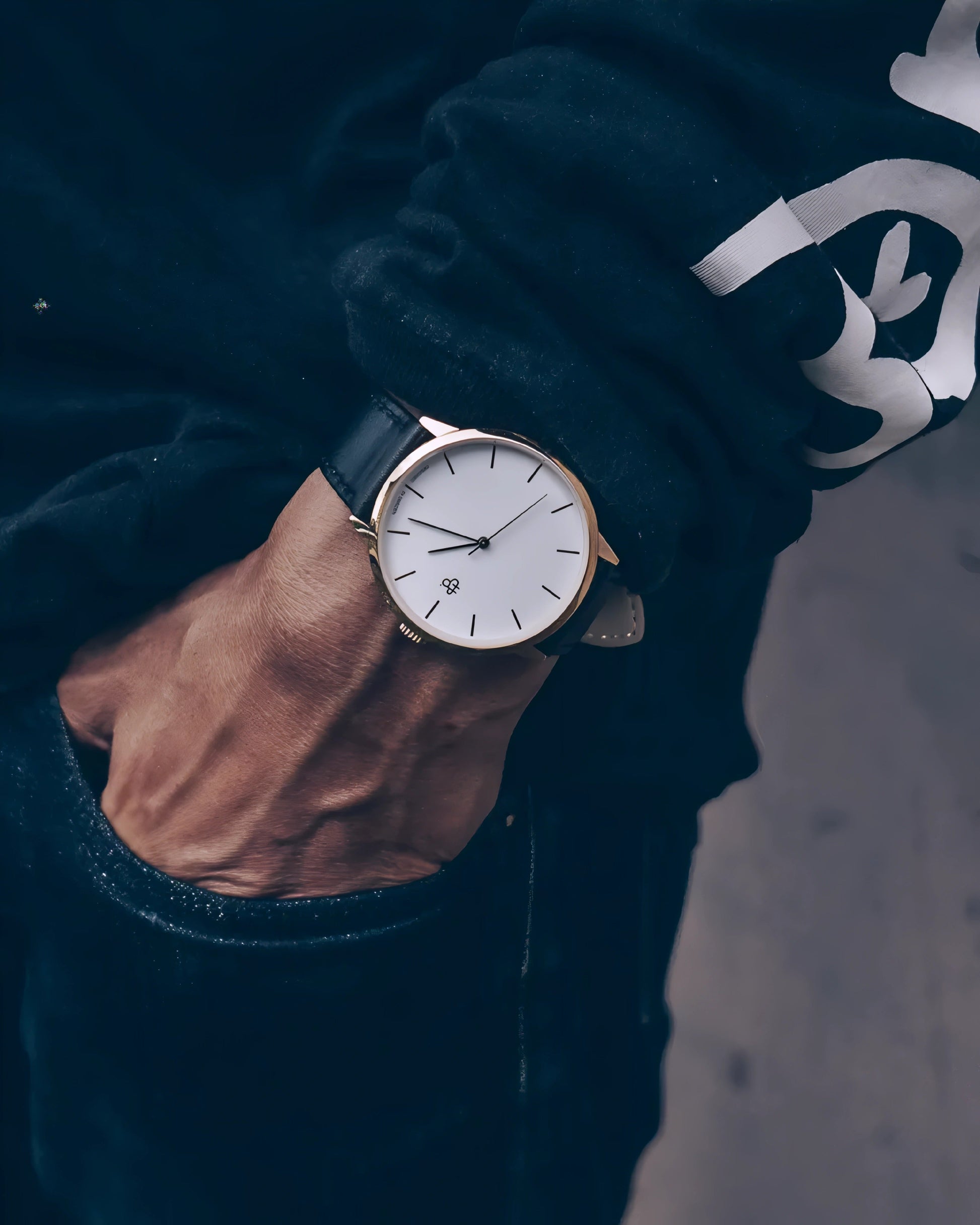 Khorshid Gold channels sharp, effortless energy—modern minimalism powered by quartz. Gold case blended with a white dial and black vegan leather strap—clean contrasts and bold character.