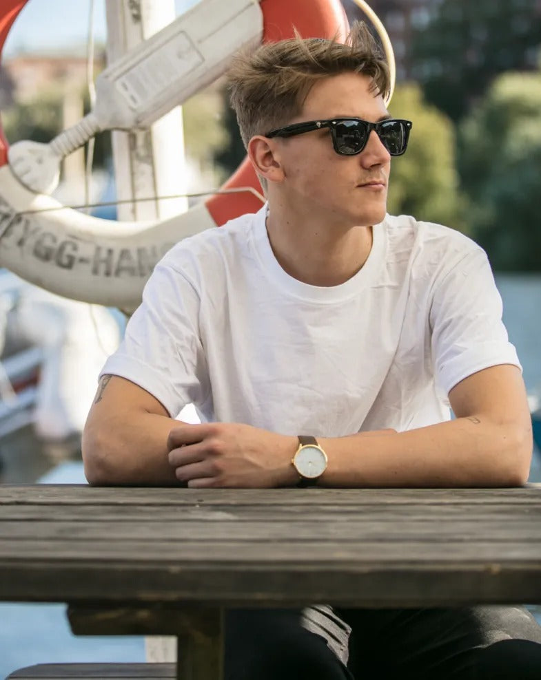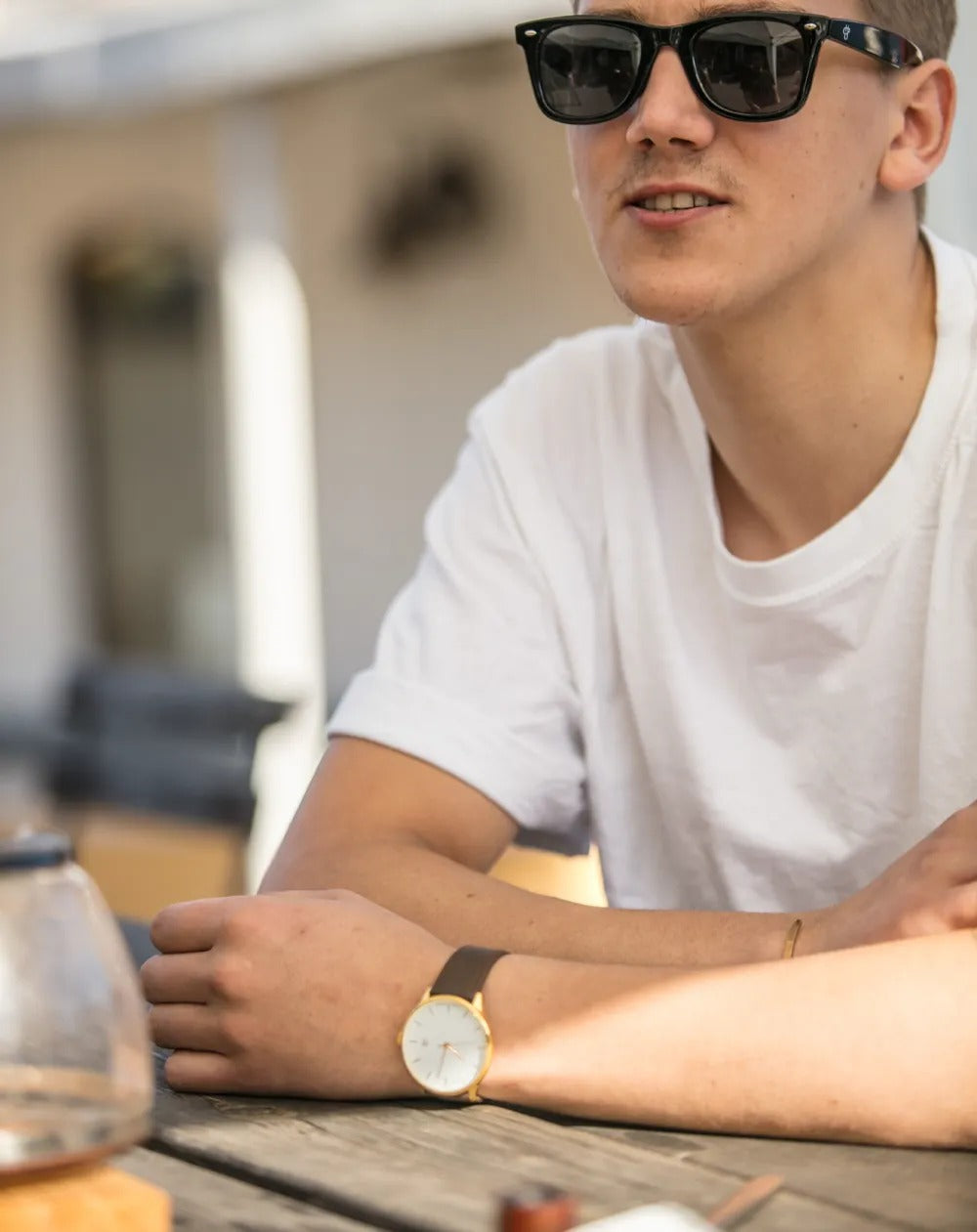 Khorshid Gold channels sharp, effortless energy—modern minimalism powered by quartz. Gold case blended with a white dial and brown vegan leather strap—clean contrasts and bold character.