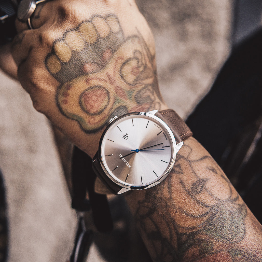 Khorshid Helsinki channels sharp, effortless energy—modern minimalism powered by quartz. Silver case blended with a silver dial and brown vegan leather strap—clean contrasts and bold character.