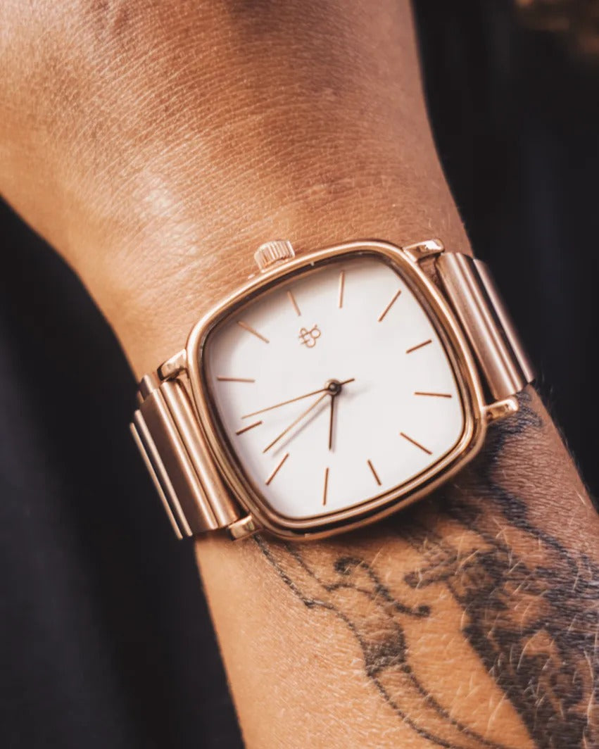Lara blends sleek curves with sharp Scandinavian minimalism—timeless, effortless, always on point. Rose Gold case, white dial, and rose gold metal strap—refined tones, effortless finish.