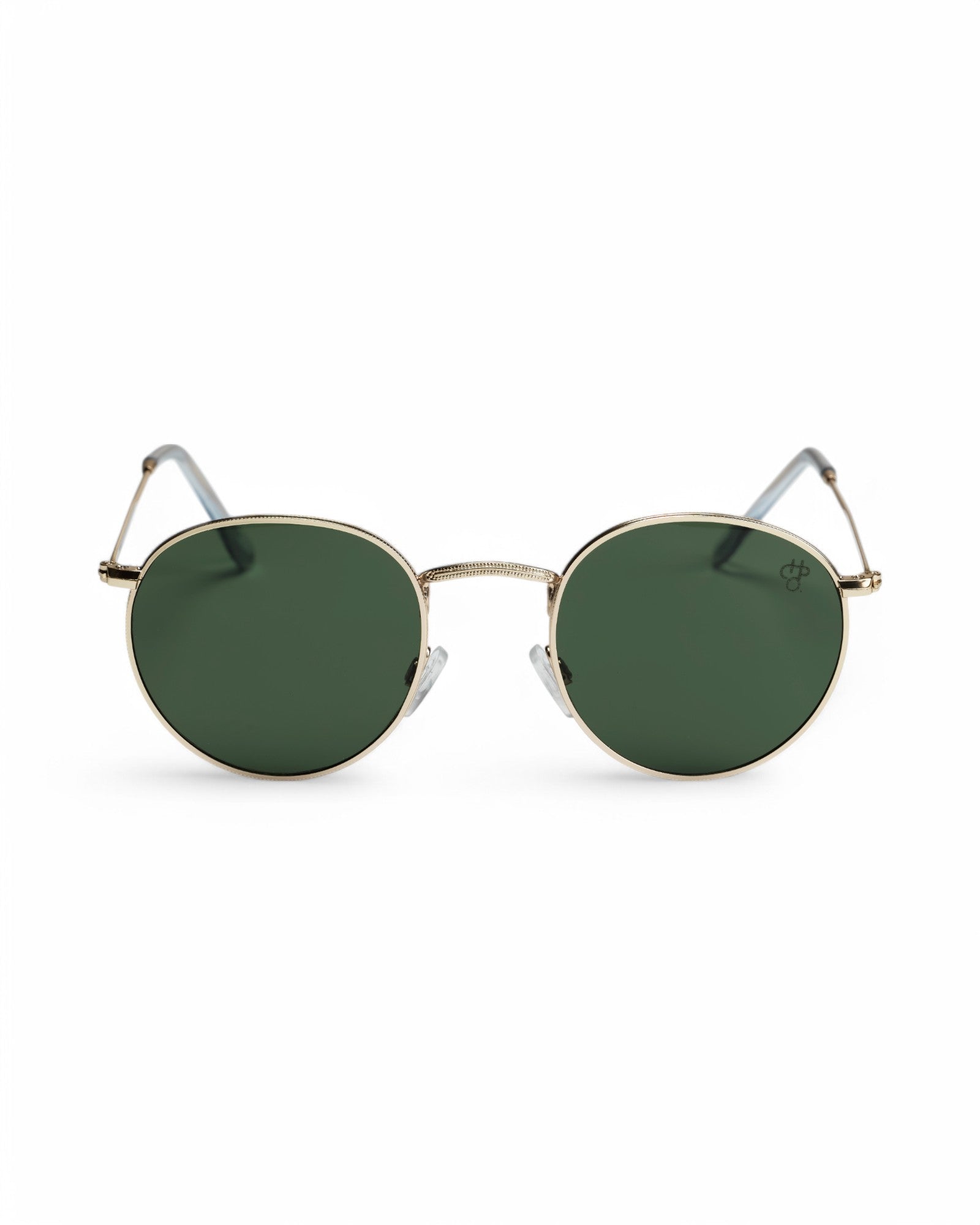 Liam shades bring laid-back confidence—bold frames with everyday edge. Gold frames combined with Green lenses—clean lines, classic appeal.