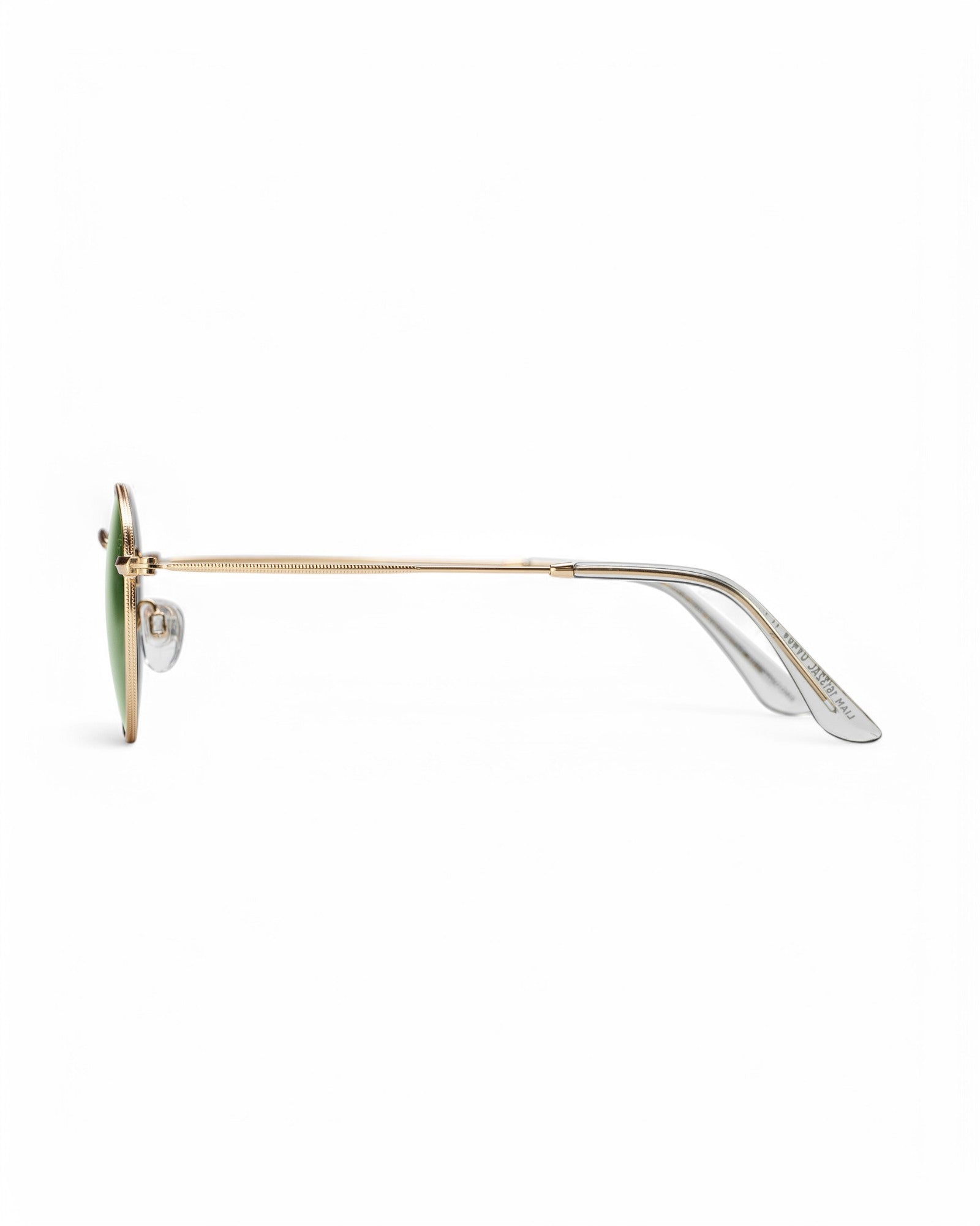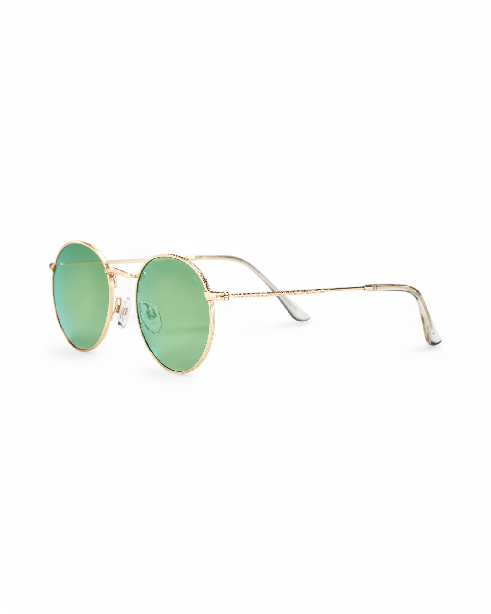 Liam shades bring laid-back confidence—bold frames with everyday edge. Gold frames combined with Green Mirror lenses—clean lines, classic appeal.