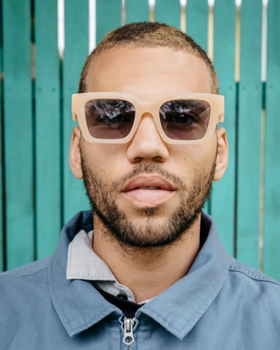Max delivers bold lines and sharp attitude—frames that don’t hold back. Milky Tea frames combined with Grey lenses—bold attitude, sharp focus.