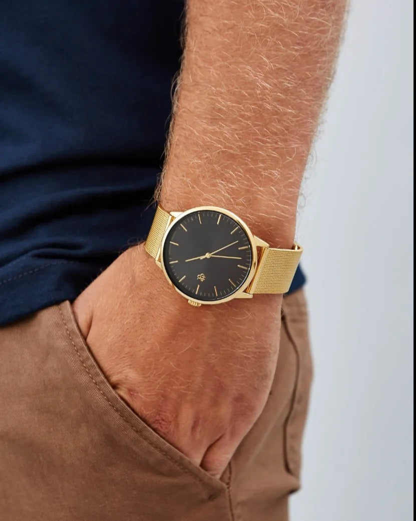 Nando Gold balances bold edge with clean simplicity—modern minimalism powered by quartz precision. Gold case, black dial, and gold metal mesh strap—strong contrasts, bold finish.