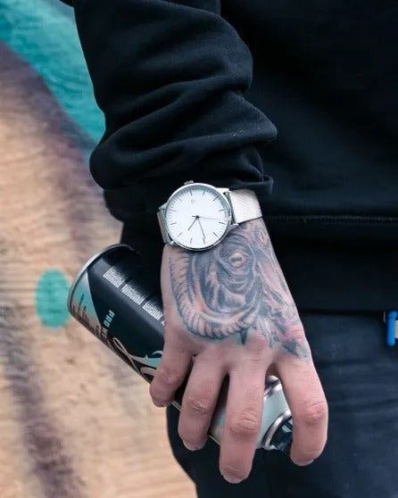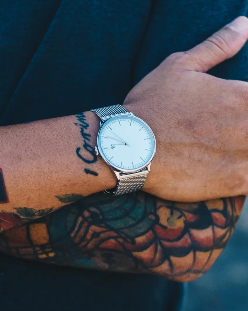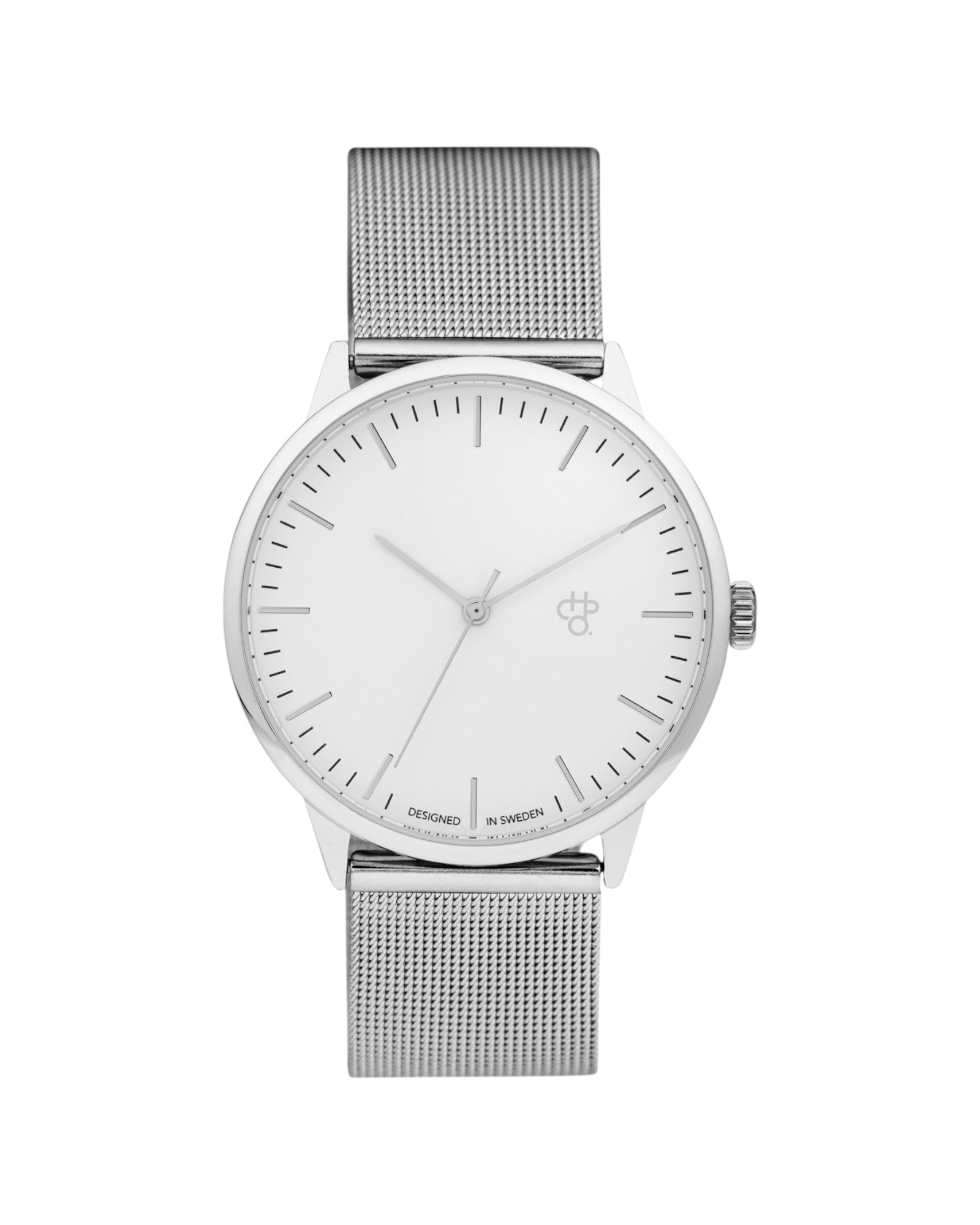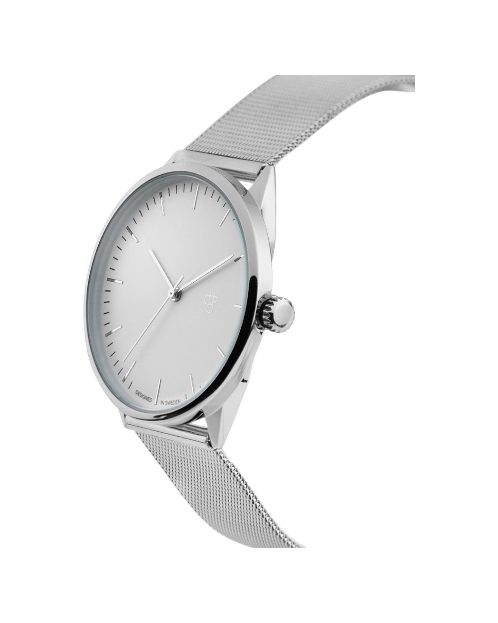 Nando Silver balances bold edge with clean simplicity—modern minimalism powered by quartz precision. Silver case, white dial, and silver metal mesh strap—strong contrasts, bold finish.