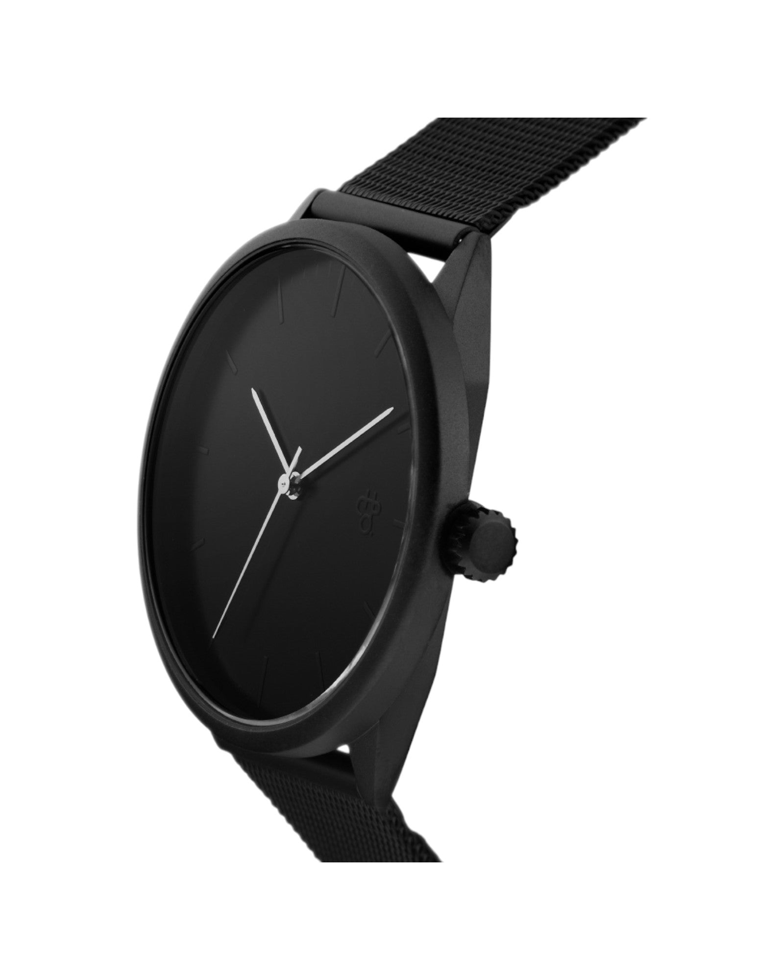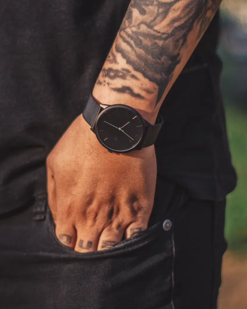 Nando Slayer balances bold edge with clean simplicity—modern minimalism powered by quartz precision. Black case, black dial, and black metal mesh strap—strong contrasts, bold finish.