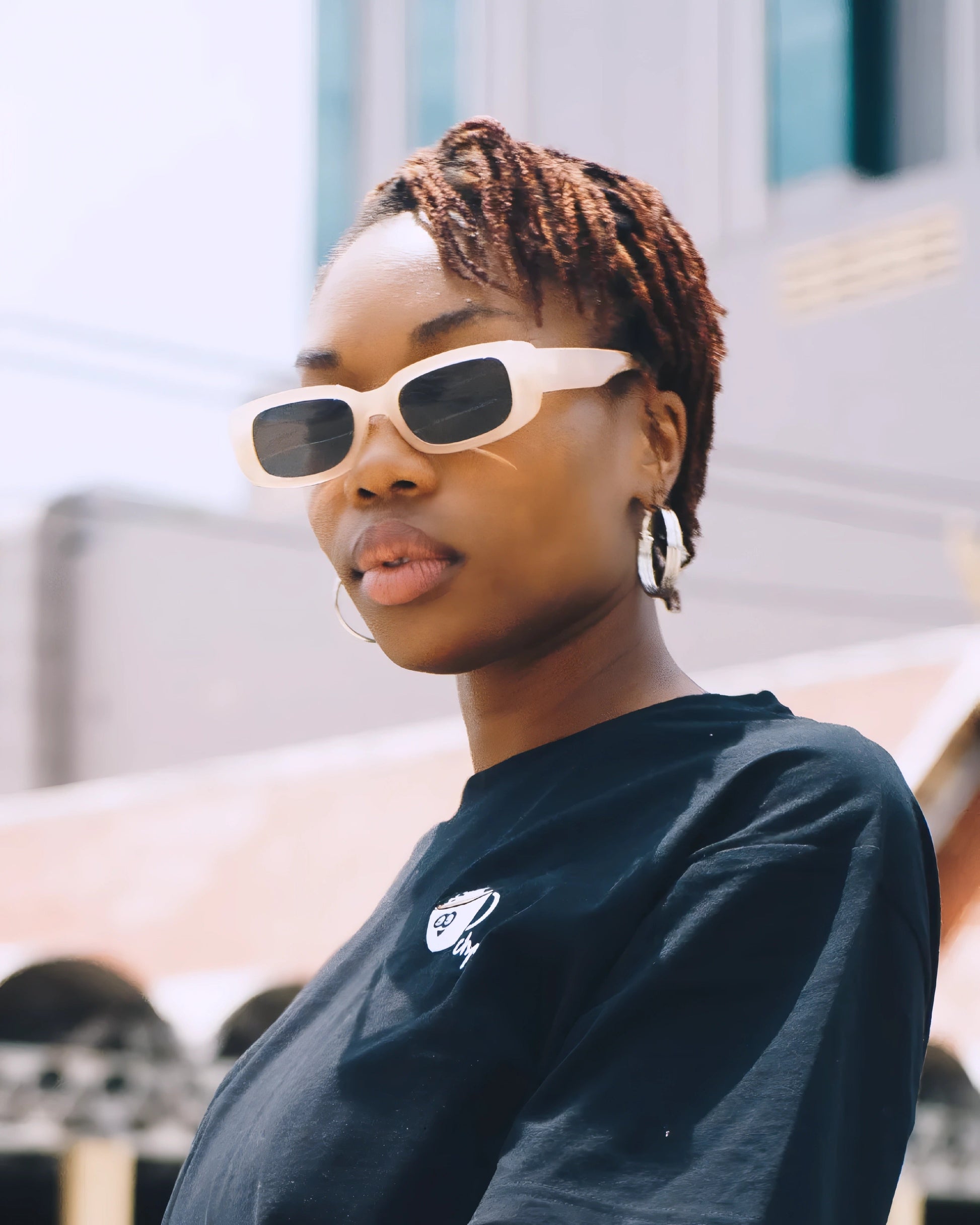 Nicole blends classic curves and subtle angles—effortlessly stylish, never overdone. Milky Tea frames combined with Grey lenses—curved, clean, effortless.