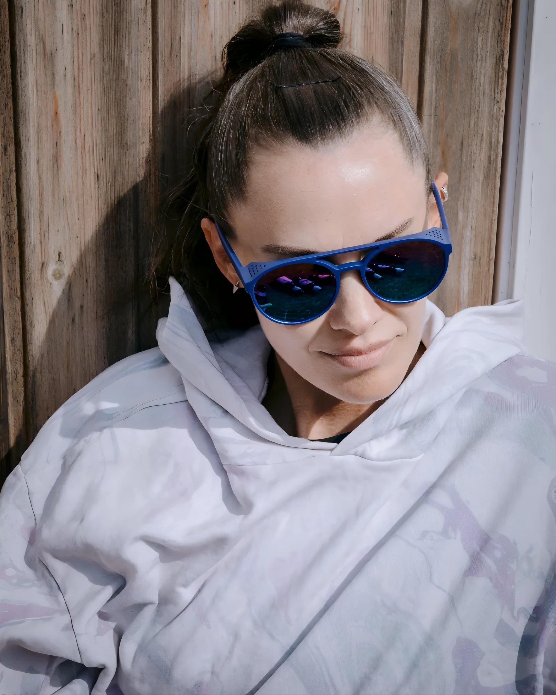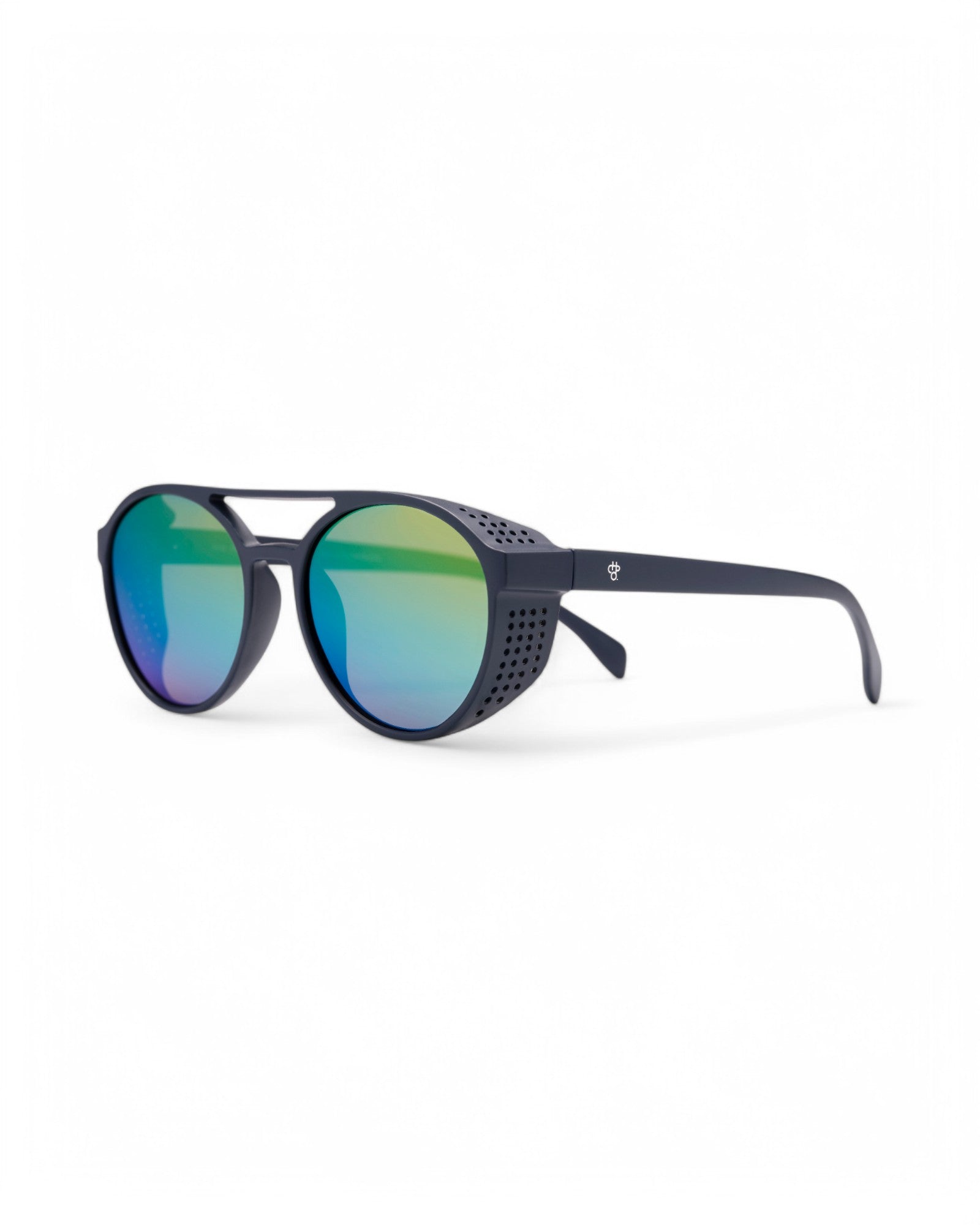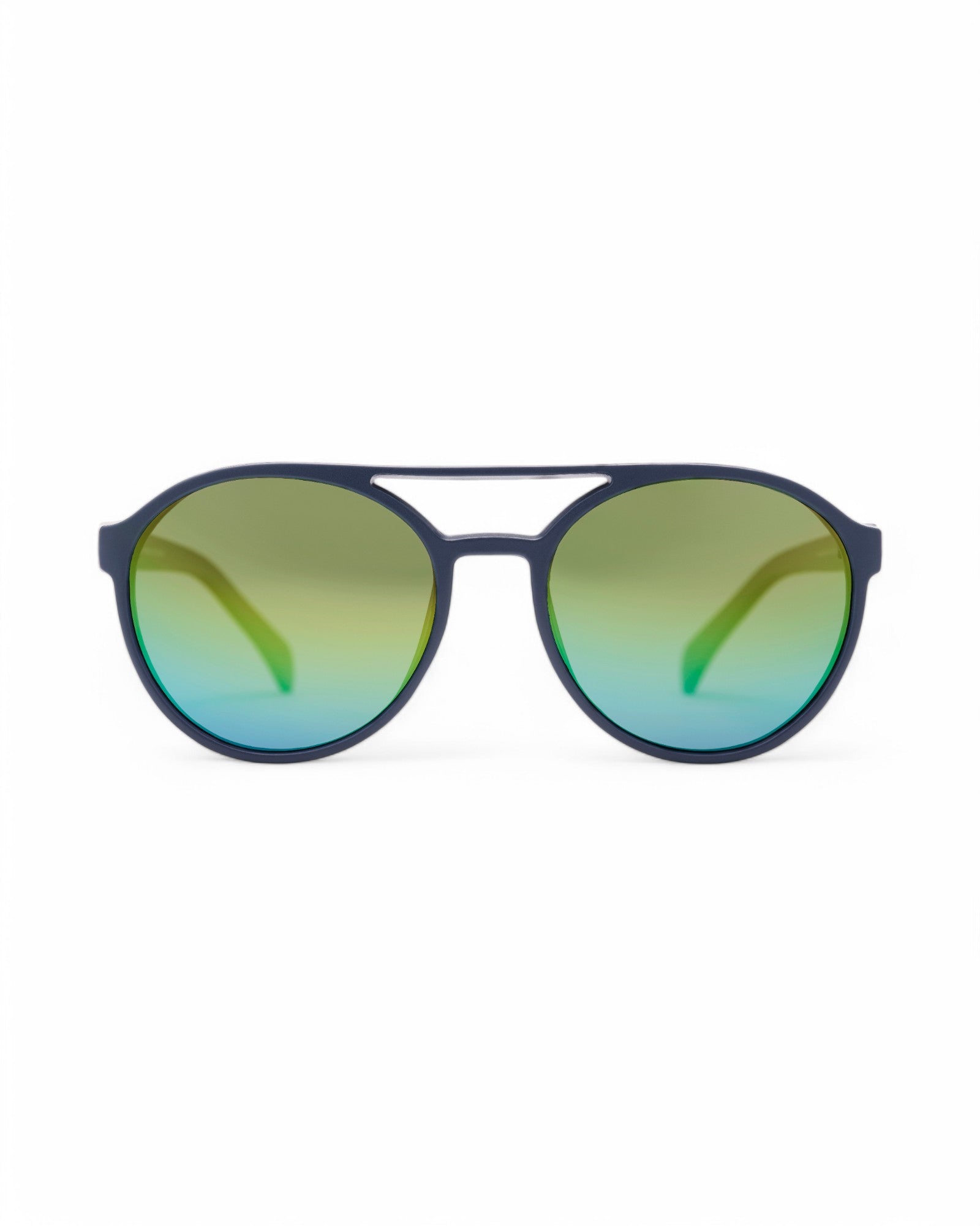 Rickard frames bring bold curves and sharp focus—clean design, big presence. Navy frames balanced with Rainbow Mirror lenses—bold curves, sharp focus.