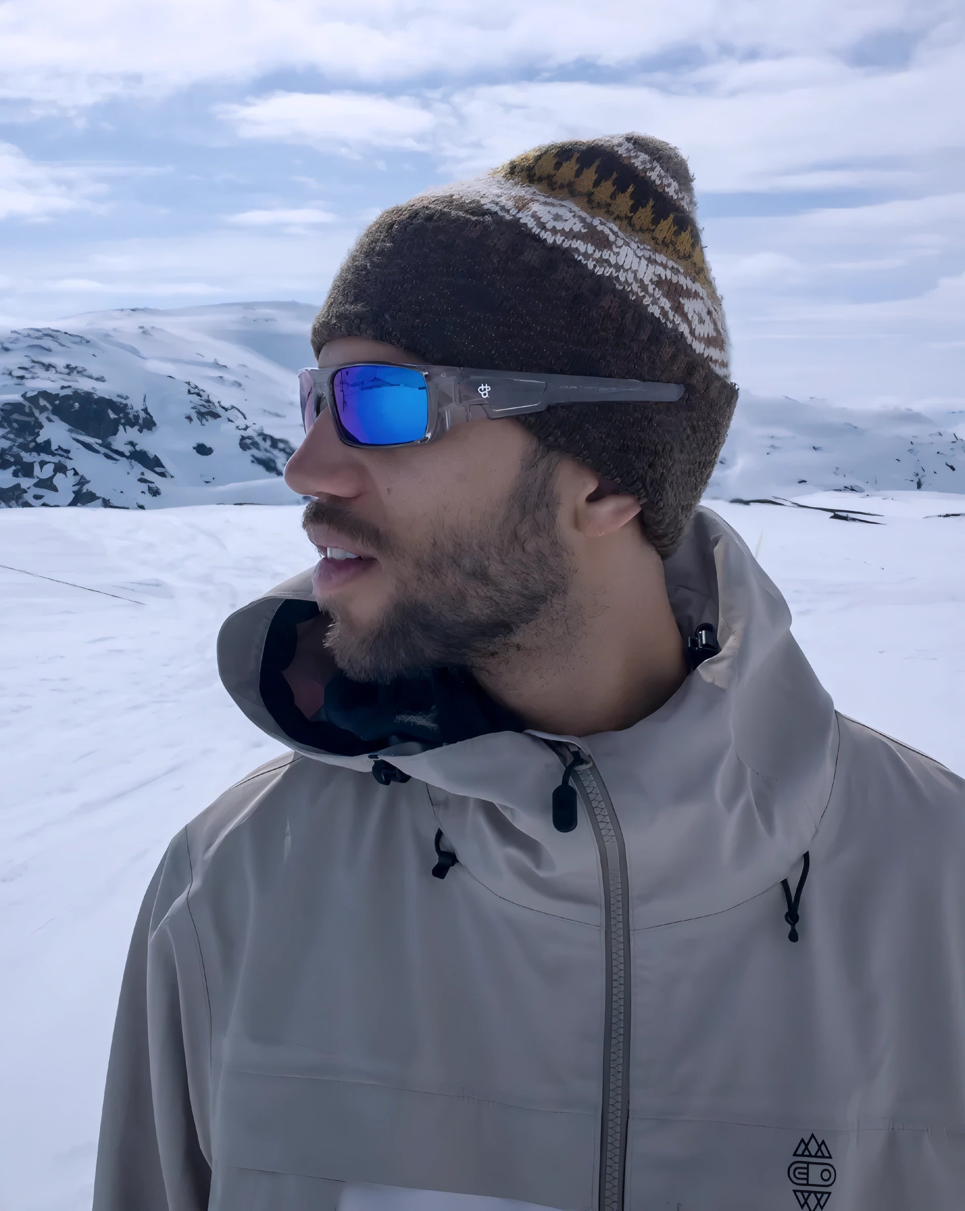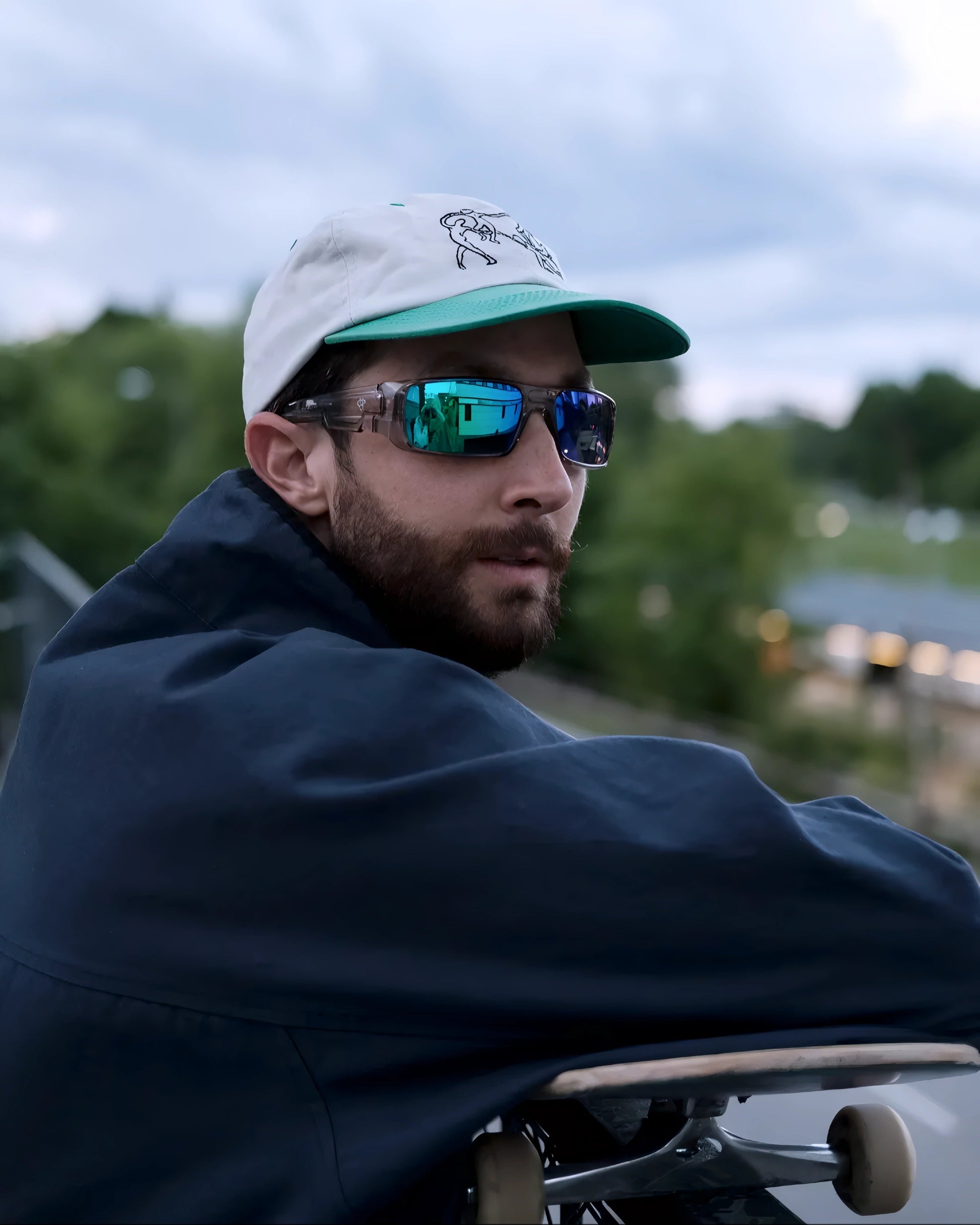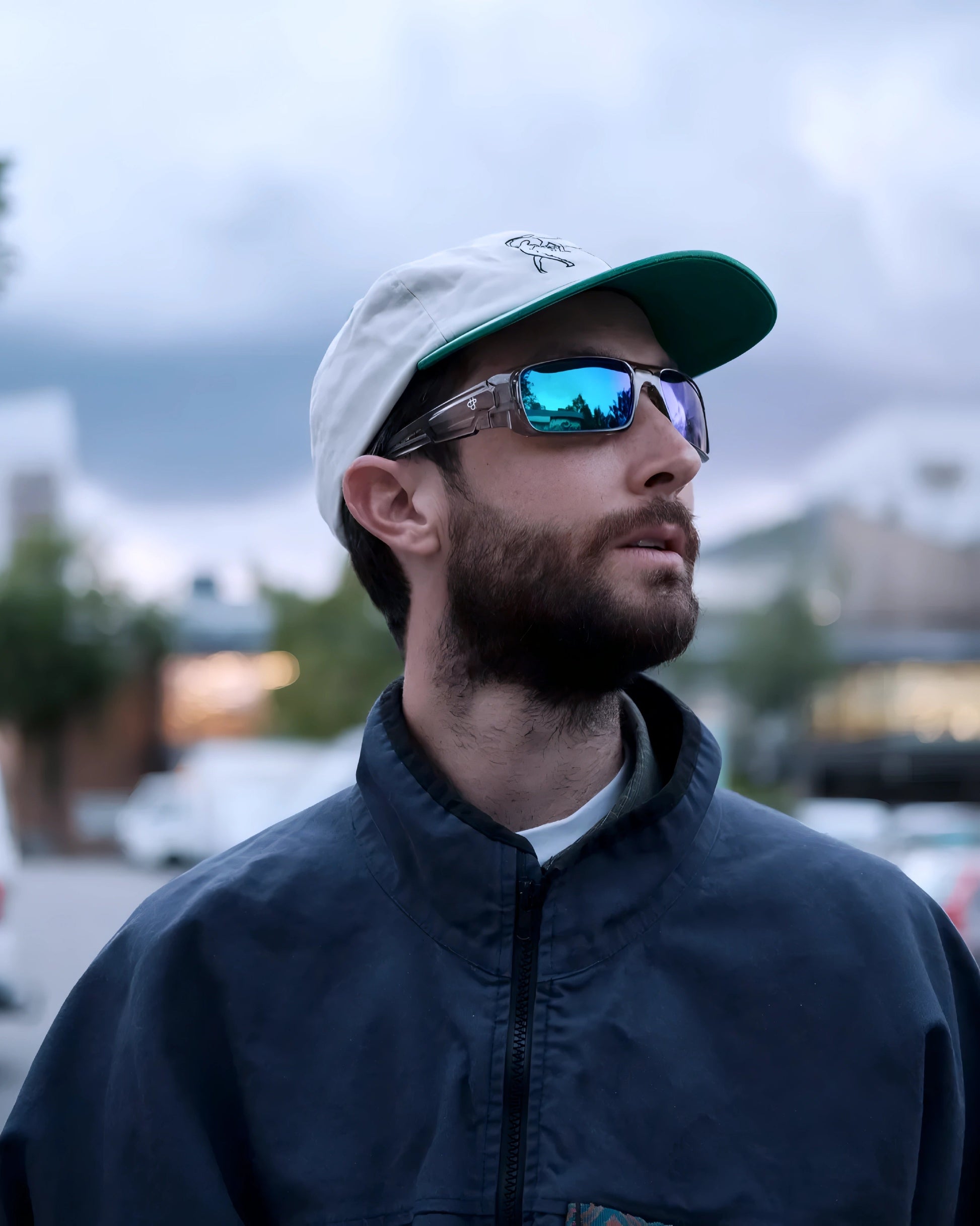 Rio frames bring strong lines and sleek edge—ready for any scene. Grey frames matched with Rainbow Mirror lenses—strong lines, sleek energy.