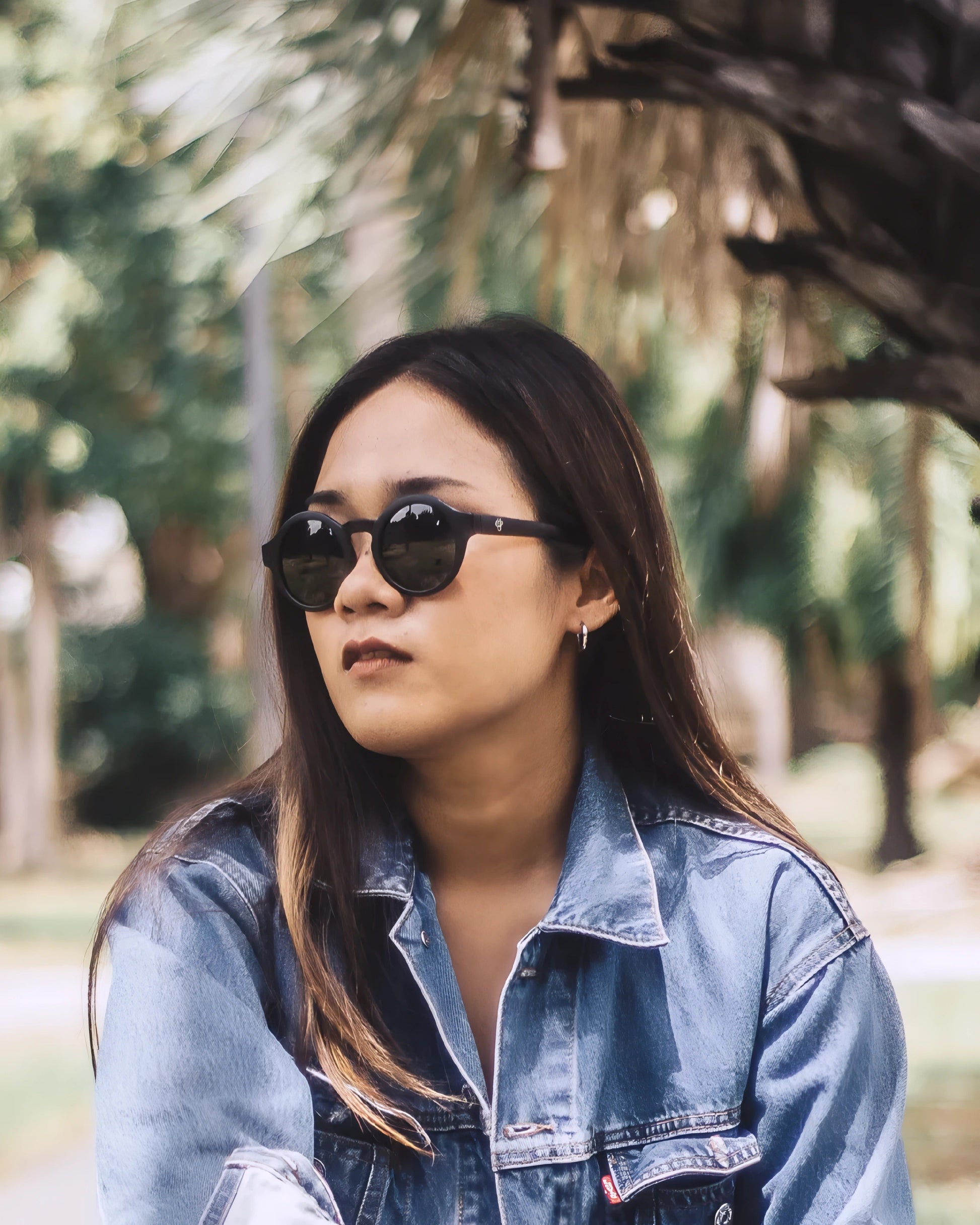 Sarah frames blend soft curves and bold lines—fresh, classic, always cool. Black frames matched with Black lenses—fresh lines, classic charm.