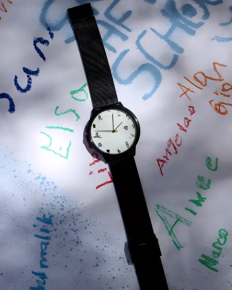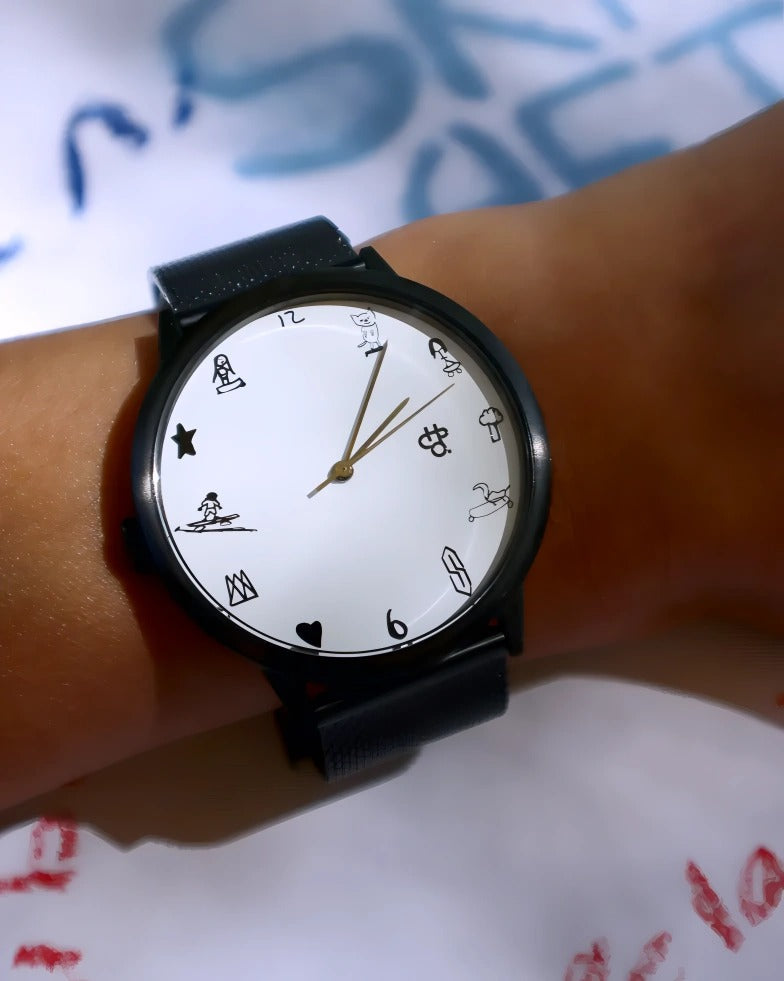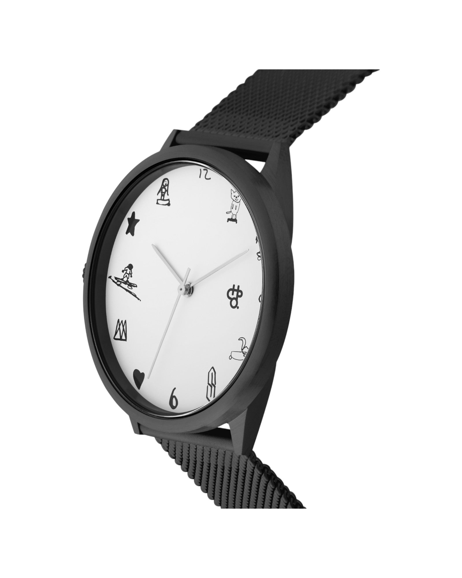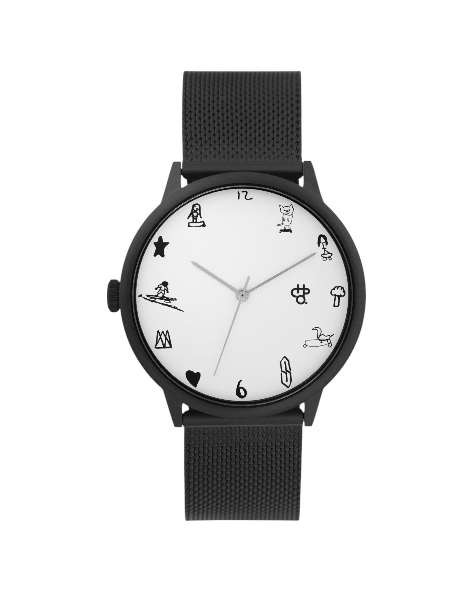 Skate After School watch blends sharp design with serious purpose—each moment fuels the future. Black case, white dial, and black metal mesh strap—bold contrasts, sharp finish.