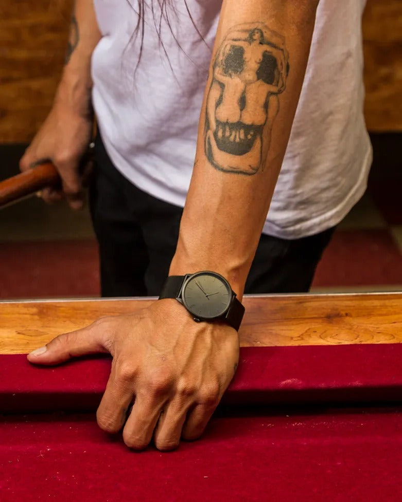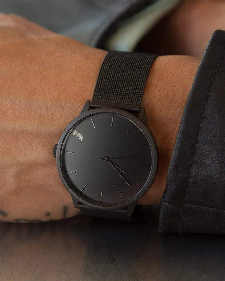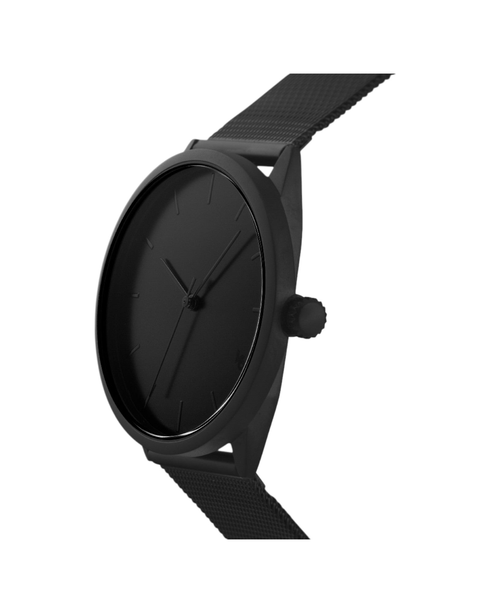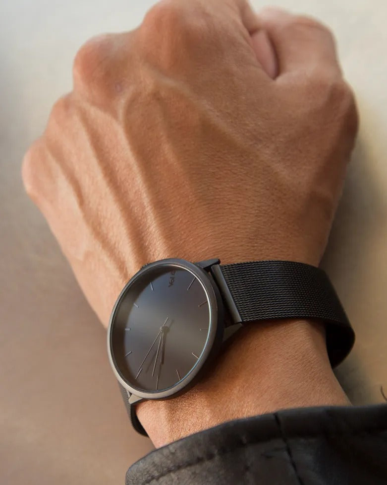 The Nuge balances bold edge with clean simplicity—modern minimalism powered by quartz precision. Black case, black dial, and black metal mesh strap—strong contrasts, bold finish.