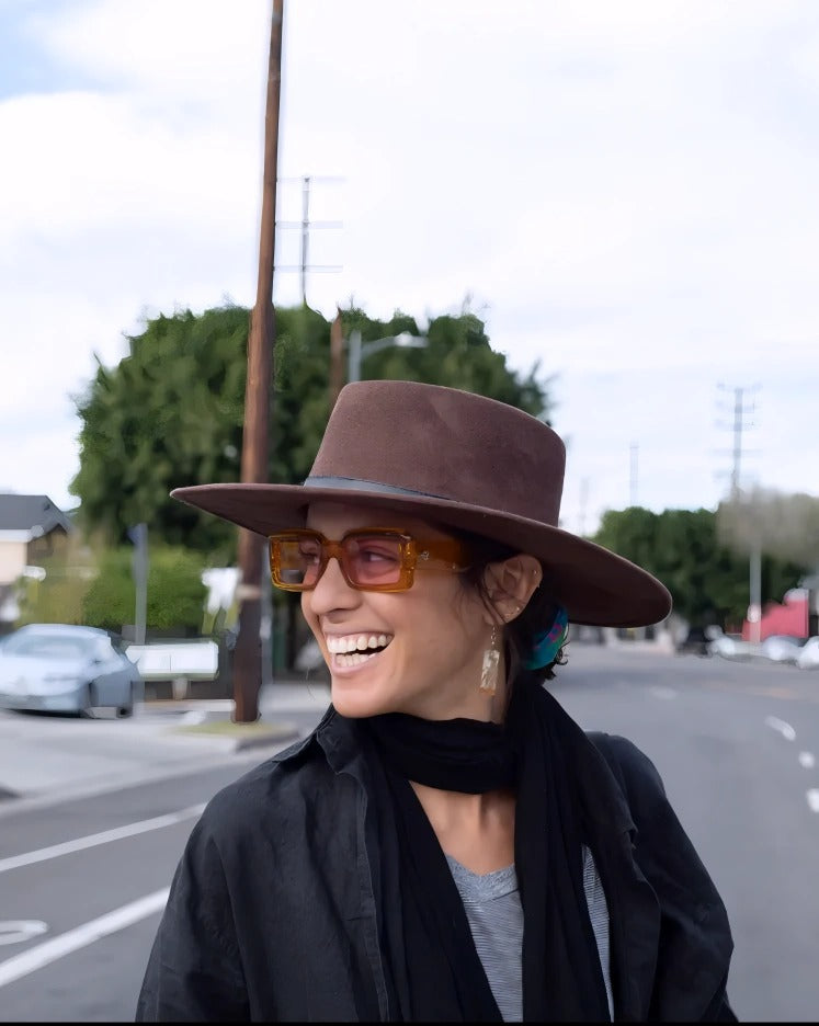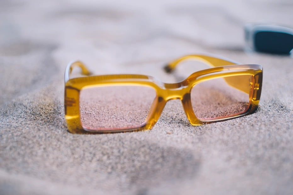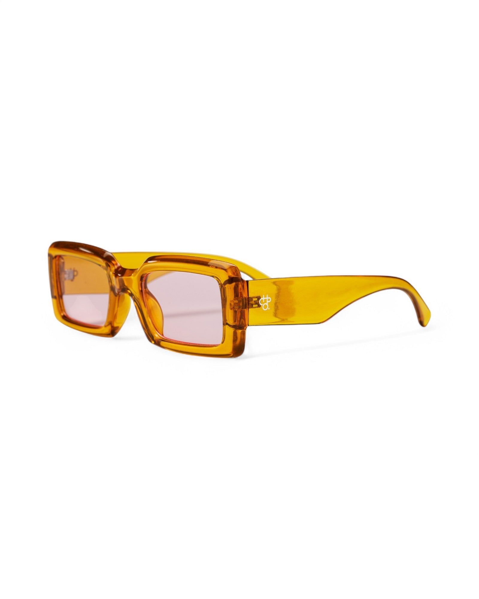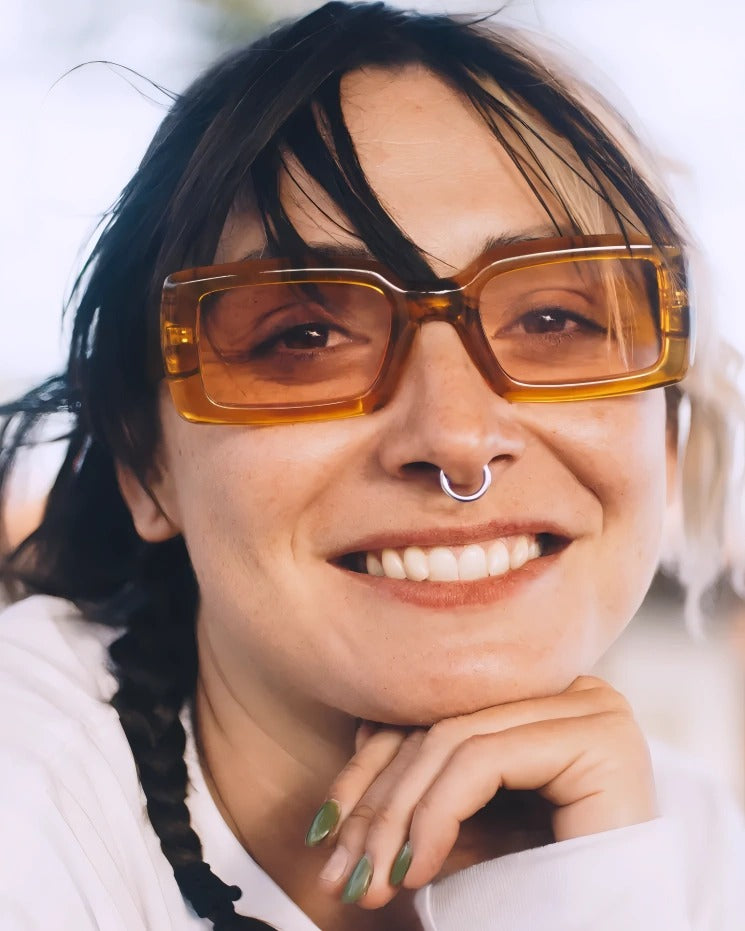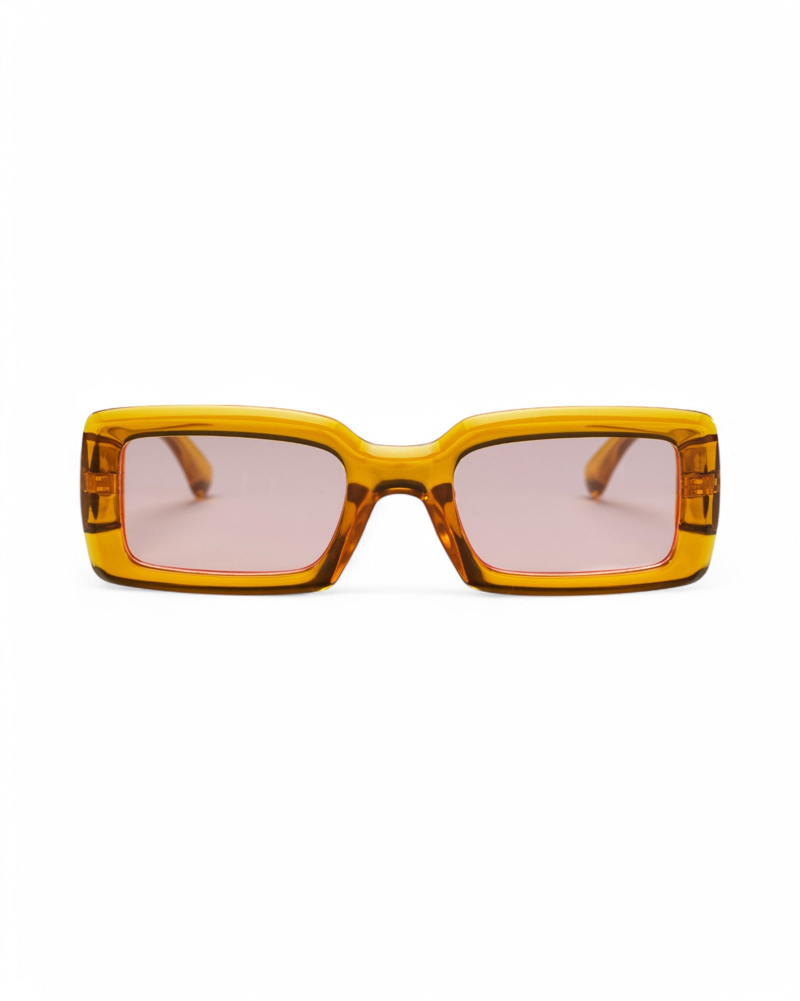 Tove frames balance soft lines and sharp angles—laid-back with a bold edge. Champagne frames matched with Pink lenses—laid-back lines, fresh edge.