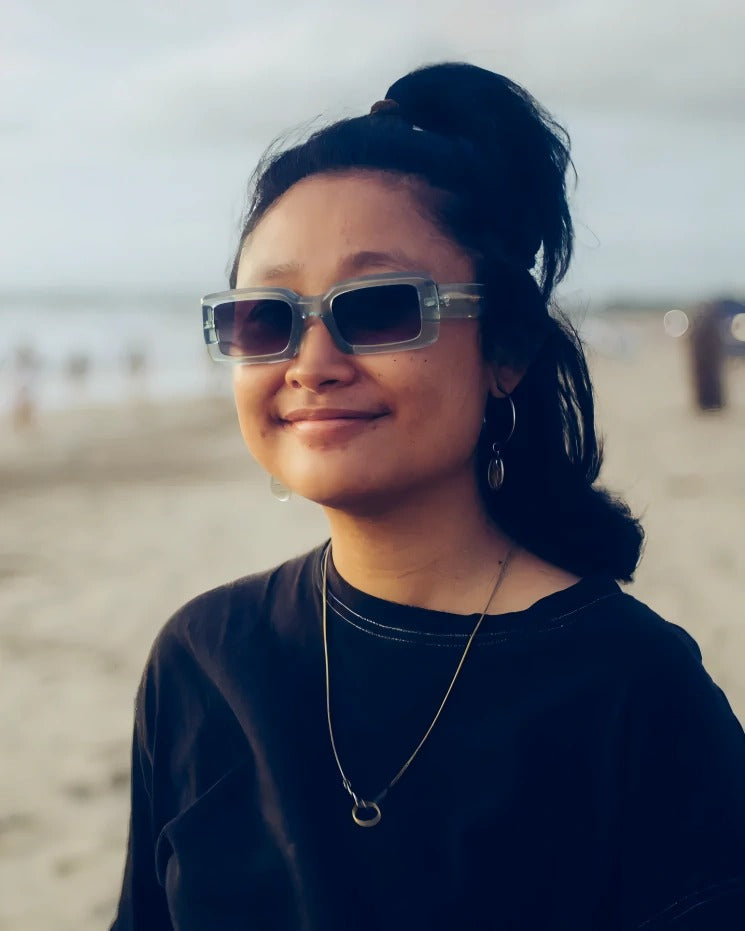 Tove frames balance soft lines and sharp angles—laid-back with a bold edge. Light Blue frames matched with Black Gradient lenses—laid-back lines, fresh edge.