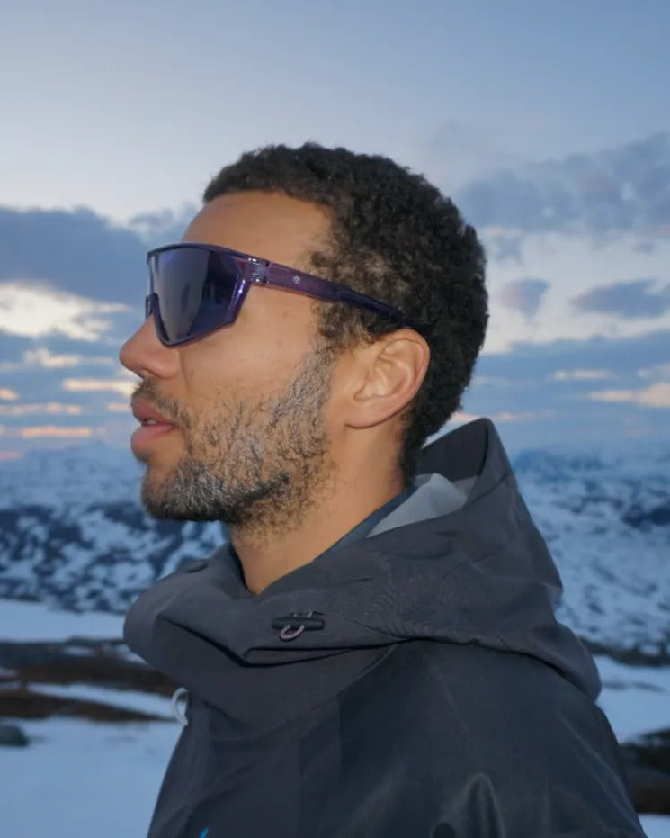Vinfred frames combine strong angles and subtle curves—confidence in every look. Indigo frames balanced with Blue lenses—bold angles, clean style.
